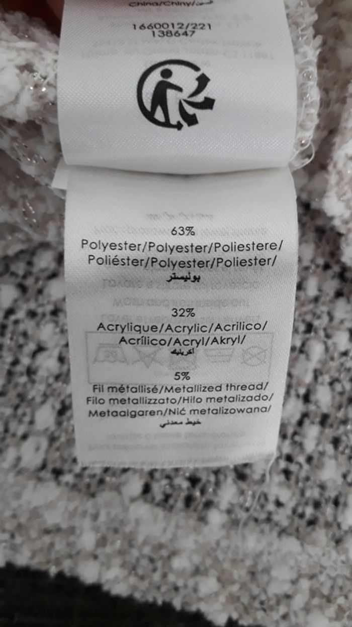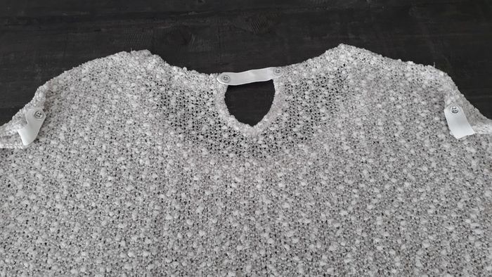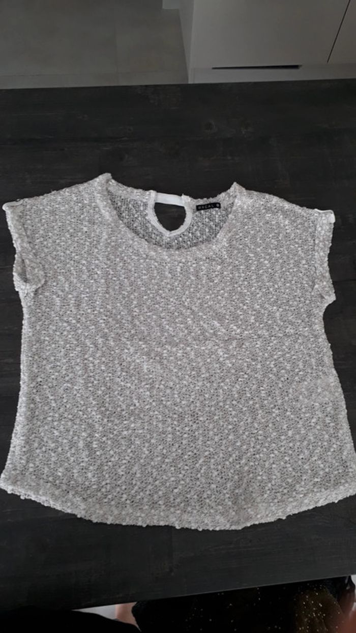 Tres peu porté, en très bon état. Jeu de transparence avec le style macramé. Classe sur une chemise blanche par exemple. Avec quelques fils argentés.