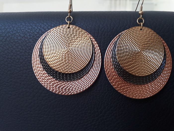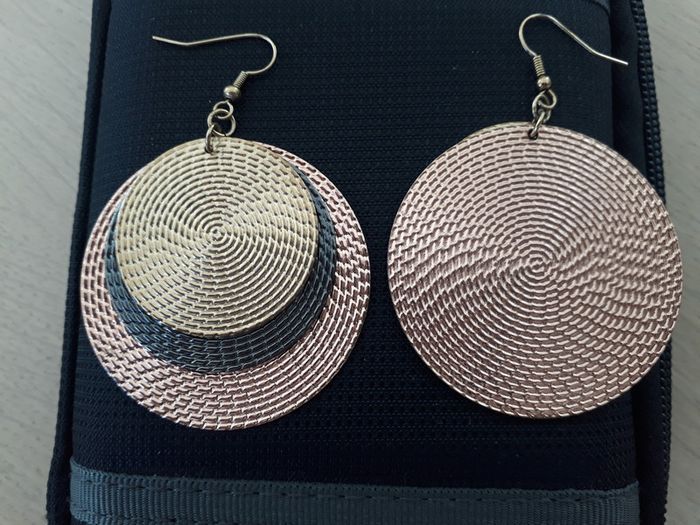 Peu portées, en parfait état. Originales, 3 ronds superposés couleurs gros foncé, doré et rosé. 6,5 cm de hauteur, 5 cm de largeur. Attache crochet.
