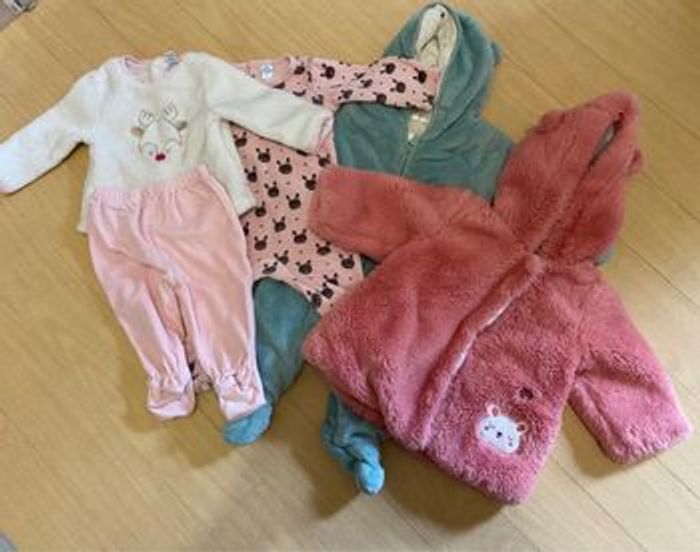 Lot contenant : - 1 manteau hiver sucre d’orge - 1 combinaison hiver orchestra - 2 pyjamas hiver
