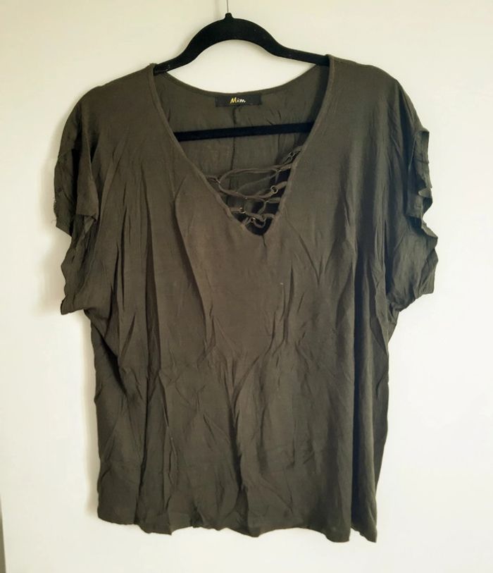 Tee-shirt fluide kaki à lacets 💸Prix négociable si lot 💸 #teeshirtyasmiinab #teeshirt #haut