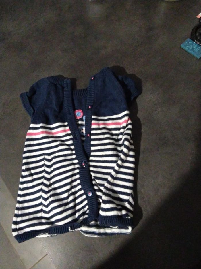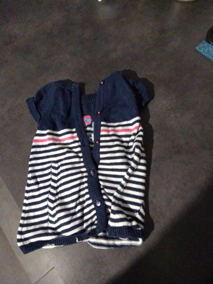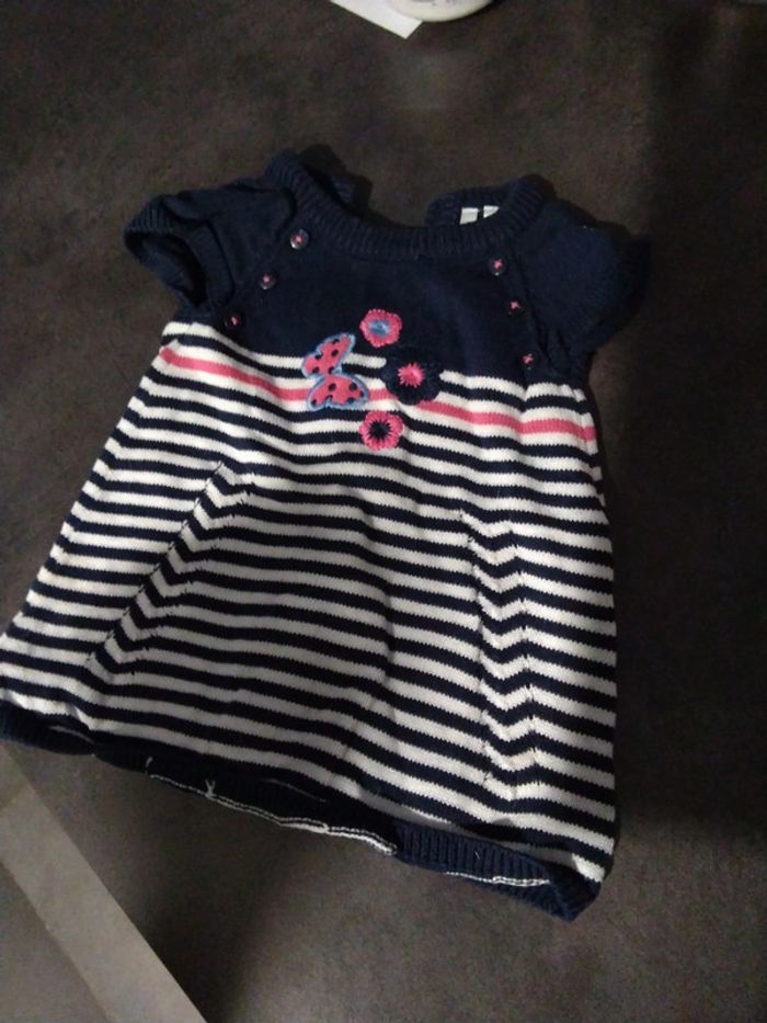 Robe en tricot Bleue a rayure blanche et rose Marque orchestra Taille 3 mois Ouverture par boutons tous le long du dos