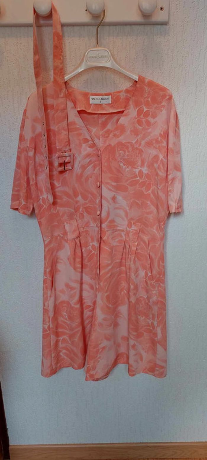 Magnifique combi short pour femme, marque UN JOUR AILLEURS, taille 42, joli imprimé grosses fleurs tons oranges, ceinture amovible, épaulettes, manches courtes ornées d'un bouton, col V, fermé par 5 boutons, 2 poches plaquées côtés short, en 100 % polyester, lavable en machine à 30° et en excellent état, vraiment comme neuf (peu porté). Acheté en boutique 179 € ...