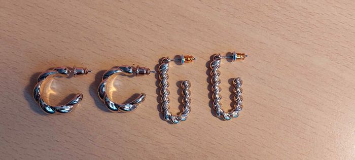 Jolie lot de 2 paires de boucles d'oreilles neuves, en métal hypoallergéniques doré, une forme créole torsadée diamètre 1,8 cm, largeur 6 mm, et une autre de forme créole allongée torsadée, longueur 2,8 cm, largeur 0,2 mm, totalement neuves et étiquetées, achetées chez Gémo 5,99 €.