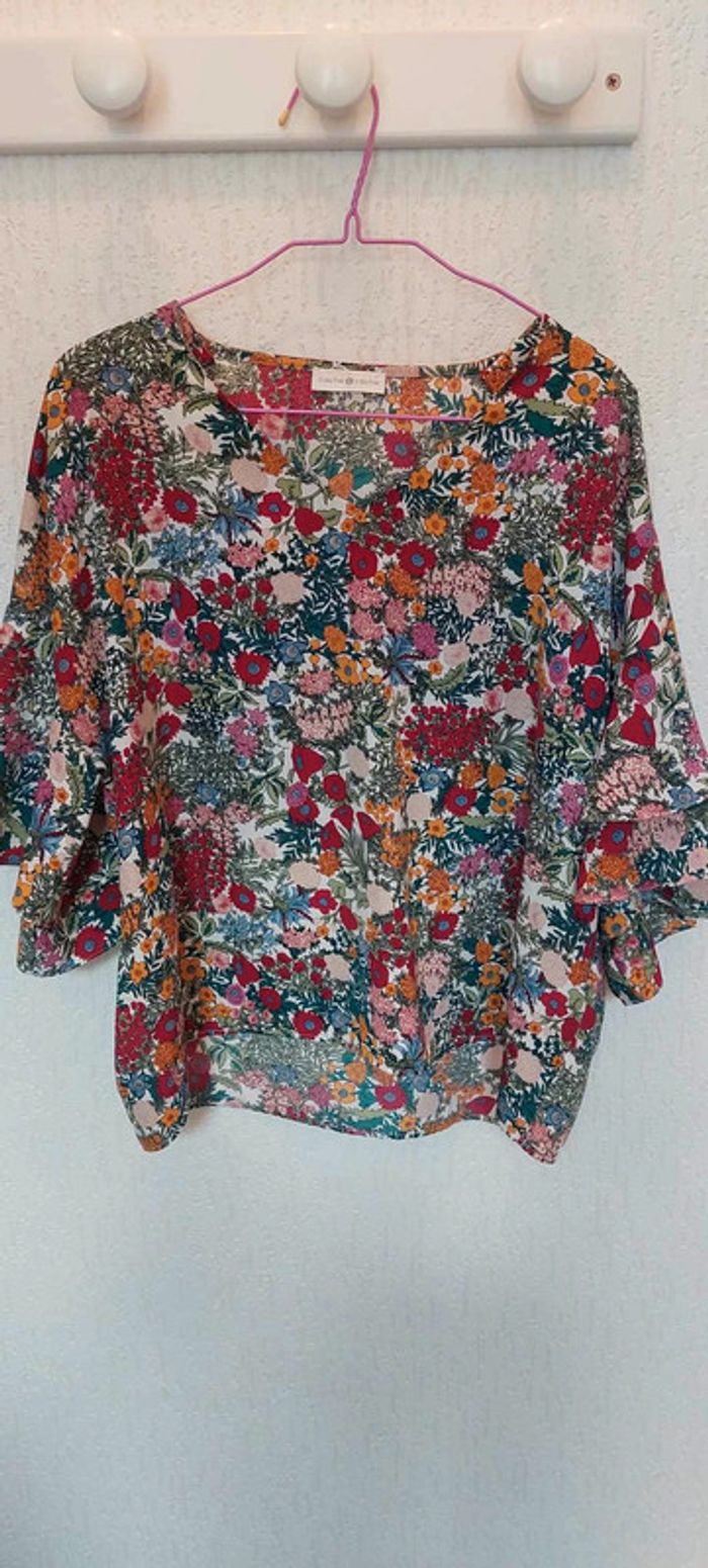 Magnifique blouse pour femme, marque CACHE CACHE, taille 40, col V, jolies manches courtes doubles volants, joli imprimé tons fleuris multicolore, en 100 % polyester épais, lavable en machine à 30° et en excellent état (peu porté).