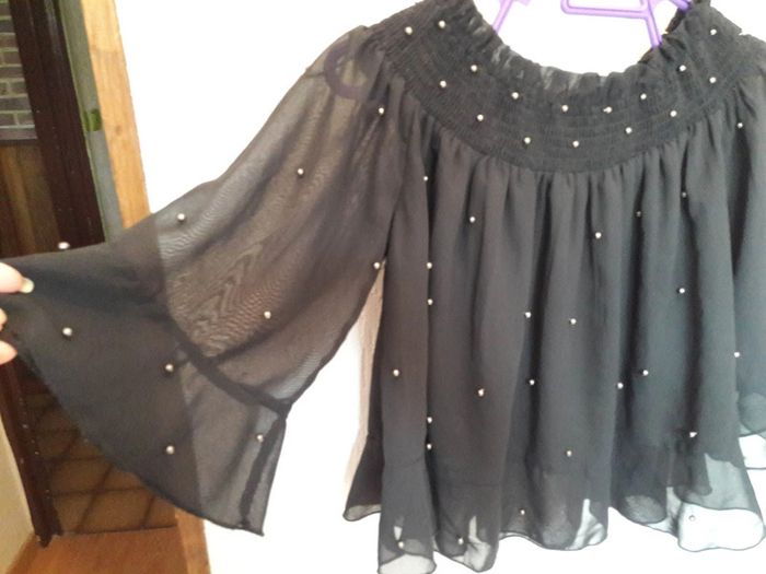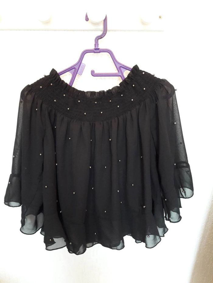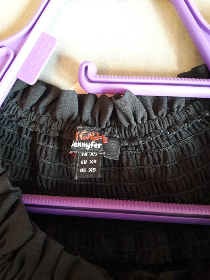 Jolie blouse ample à volants pour femme, marque JENNYFER, taille XS (mais convient à un S), de couleur noir, manches 3/4 en tulle transparent, totalement doublé (sauf manches), jolies perles argentées sur le devant, peut être porté tel quel ou sous les épaules pour les dénuder, en viscose et polyester, lavable en machine à 30° et en excellent état (peu porté). Acheté en boutique 24,99 €...