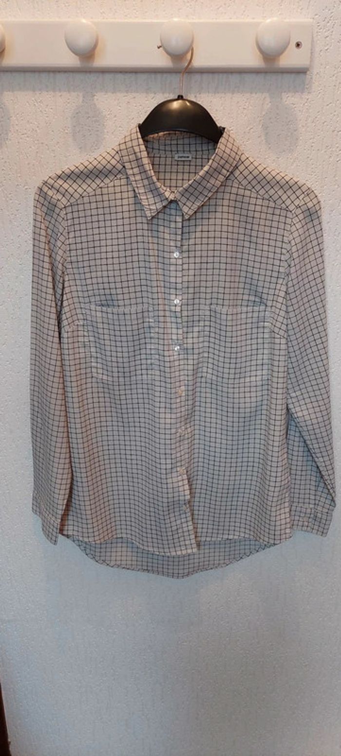 Belle chemise femme Pimkie M à carreaux crème/bleu marine aspect satinée excellent état - photo numéro 1