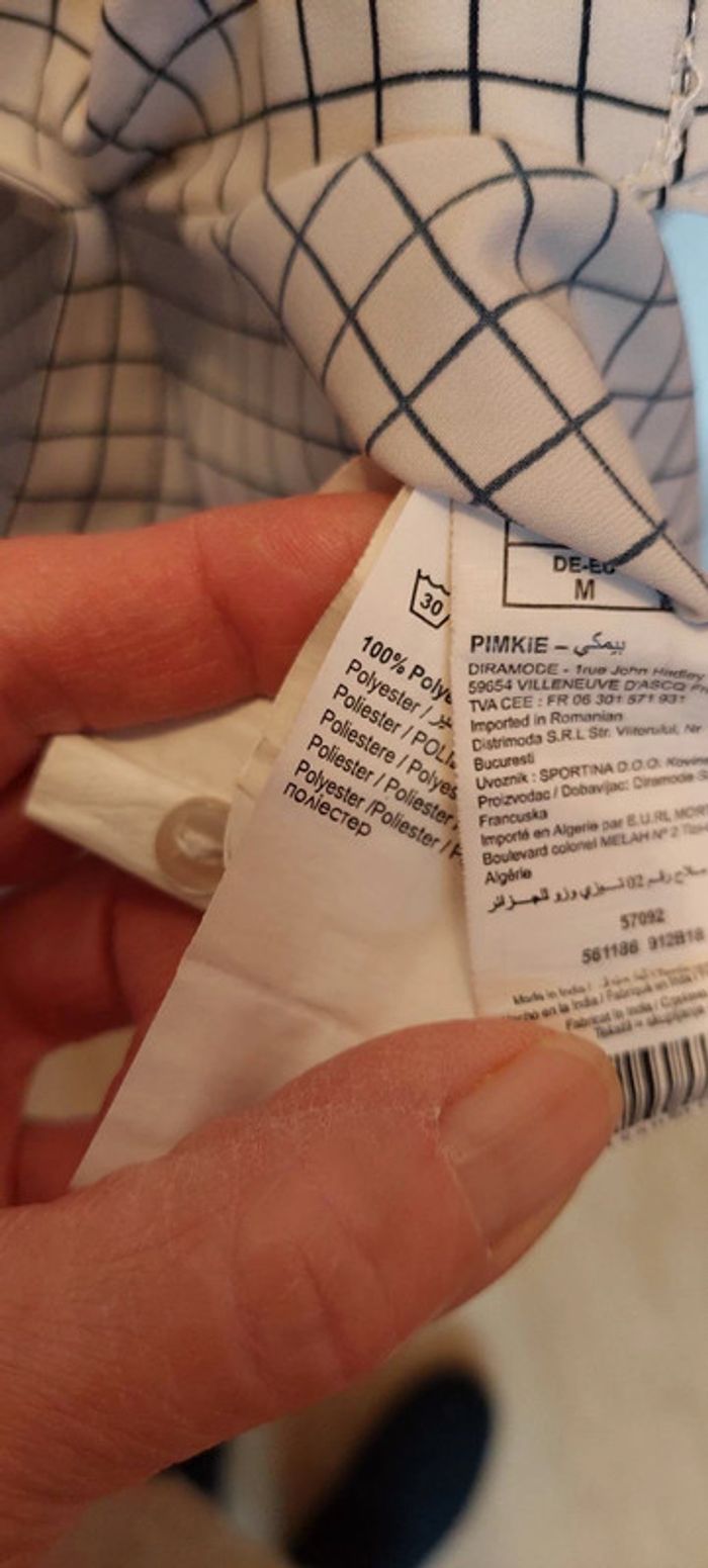 Belle chemise pour femme, marque PIMKIE, taille M, manches longues, petit col, à petits carreaux, 2 poches poitrine, couleur crème/bleu marine, en 100 % polyester, lavable en machine à 30°, aspect satiné, fermeture petits boutons nacrés crème (+1 de rechange cousu sur étiquette intérieure) et en excellent état, peu portée.
