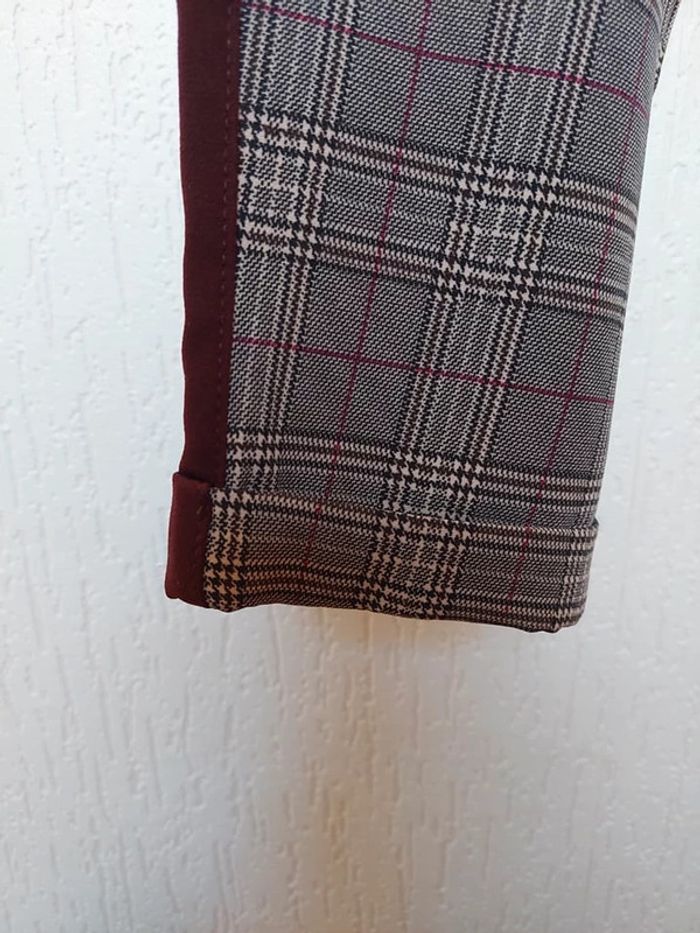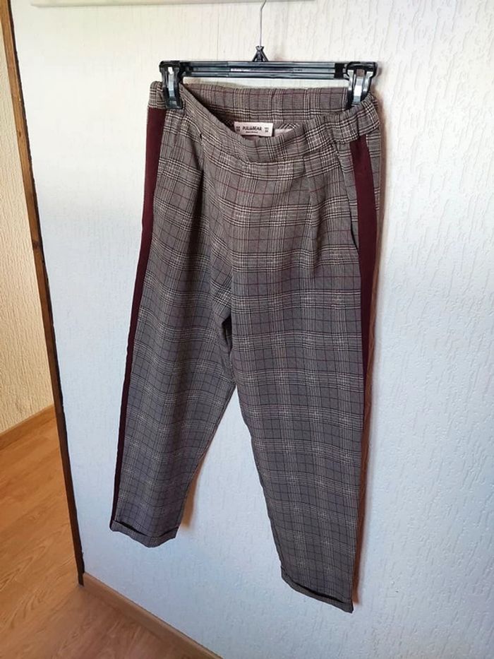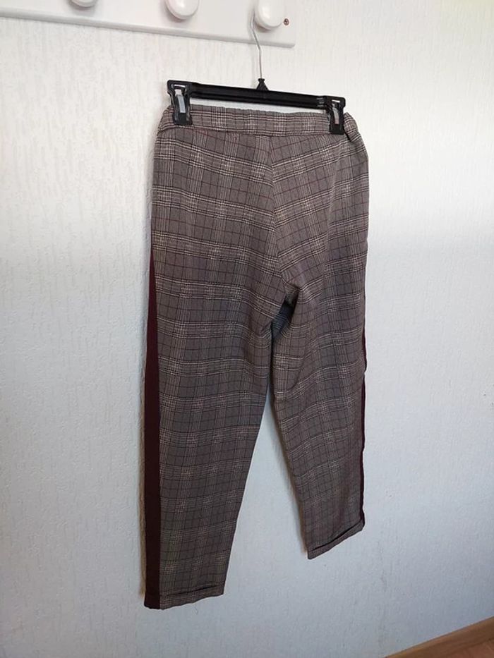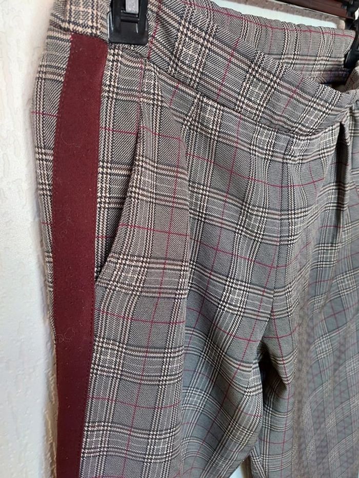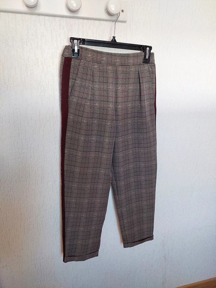 Beau pantalon à pince pour femme, taille XS (34), marque Pull&Bear, à carreaux tons gris, bandes de chaque côté couleur bordeaux, revers en bas des jambes, 2 poches plaquées sur le devant, taille élastiquée, en 90 % polyester et 10 % elasthane, lavable en machine à 30°. Peu porté, en excellent état et acheté 29,90 € sur le site.