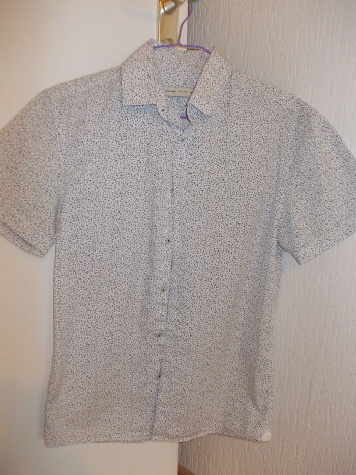 Belle chemise cintrée pour femme, manches courtes, marque Célio, taille S (37/38), couleur crème à motifs petites feuilles bleu marine, boutons nacrés, en 100 % coton, lavable à 40° et en très bon état (peu portée).