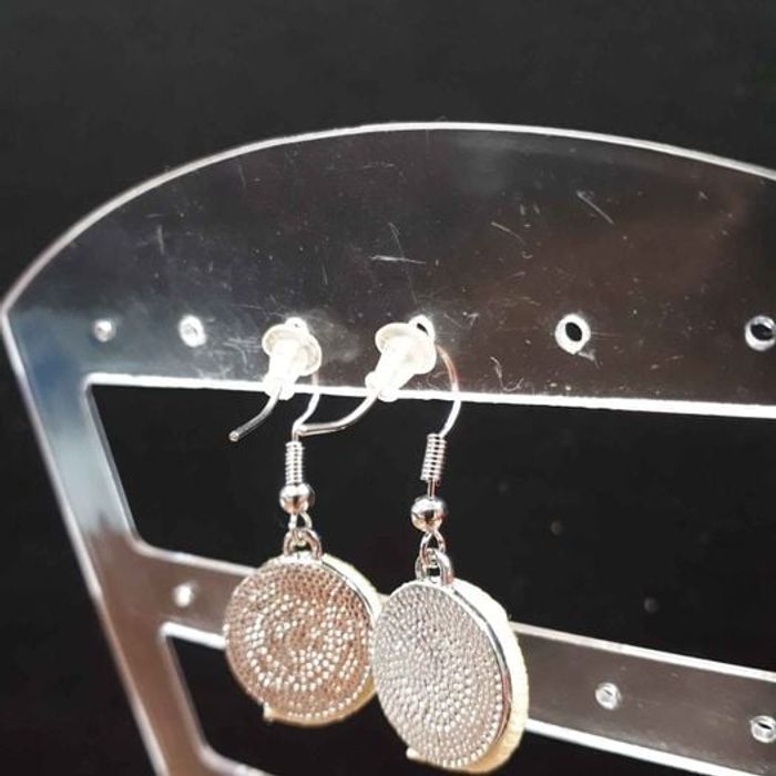 Boucles d'oreilles femme Forme spirales Matières métal et tissus Couleurs argenté et beige Fermoirs crochets Dimension 3,5cm de long et 1,5cm cm de large En très bon état