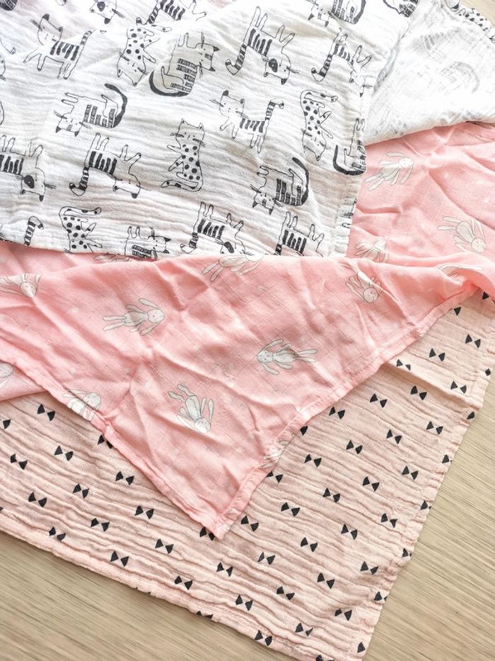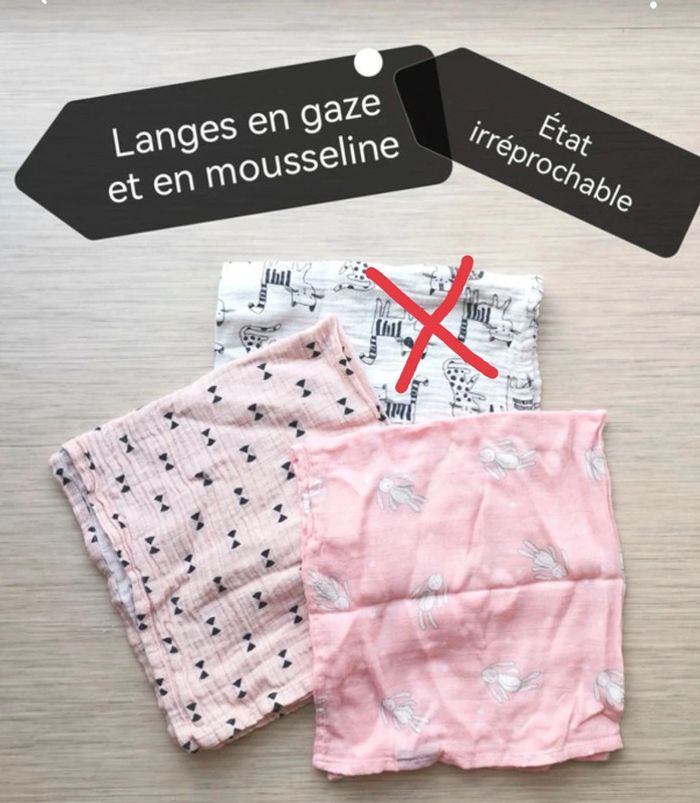 #Luffyshop_puericulture Lot de 2 langes à motif, dont 1 en gaze de coton et 1 rose en mousseline. Motifs chats et lapin État irréprochable