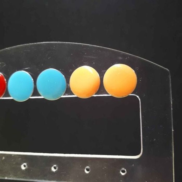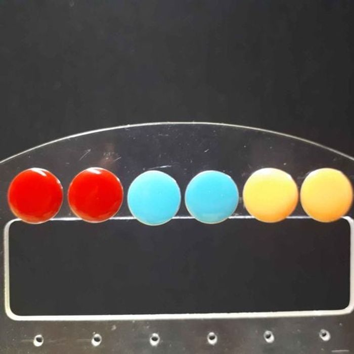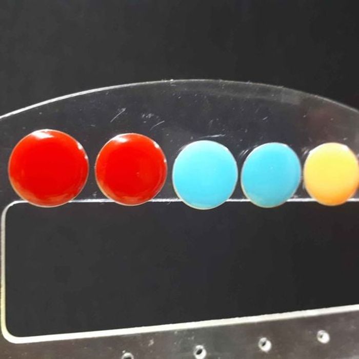 Boucles d'oreilles femme Forme rondes Matière métal Couleurs argenté, orange, rouge et bleu Fermoirs clous Dimension 1cm de diamètre En très bon état 2€ les 3 paires