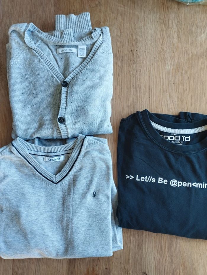 Lot 10 ans Okaïdi garçon, 1 gilet boutonné 1 pull fin, 1 t-shirt manches longues