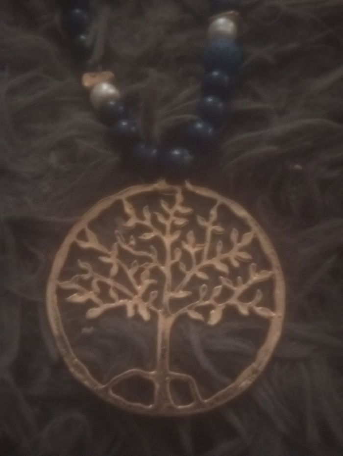 Collier perle bleu et nacré avec un gros arbre de Vie doré fantaisie