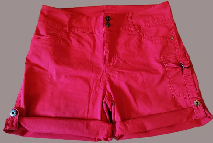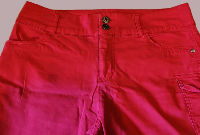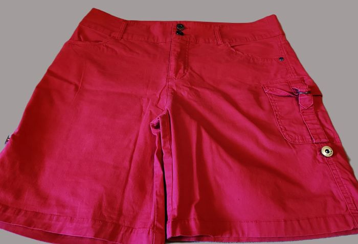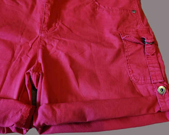 Bermuda rouge taille 42 qui se transforme en short à l'aide d'une sangle accroché à un bouton. 2 boutons et fermeture éclair, passants pour ceinture. 2 poches latérales sur le devant, 1 avec rabat sur le côté et 2 poches à l'arrière. L'étiquette de la marque et de la taille a été enlevée soigneusement par ma maman car ça la gênait (elle était couturière de métier) mais elle avait l'habitude d'acheter des vêtements de qualité (voir dimensions). En parfait état. Taille à plat : 42 cm Le rouge a été altéré par la photo. D'autres vêtements sont en vente dans mon dressing, réduction automatique de 10 à 20% sur les lots à partir de 2 articles achetés.
