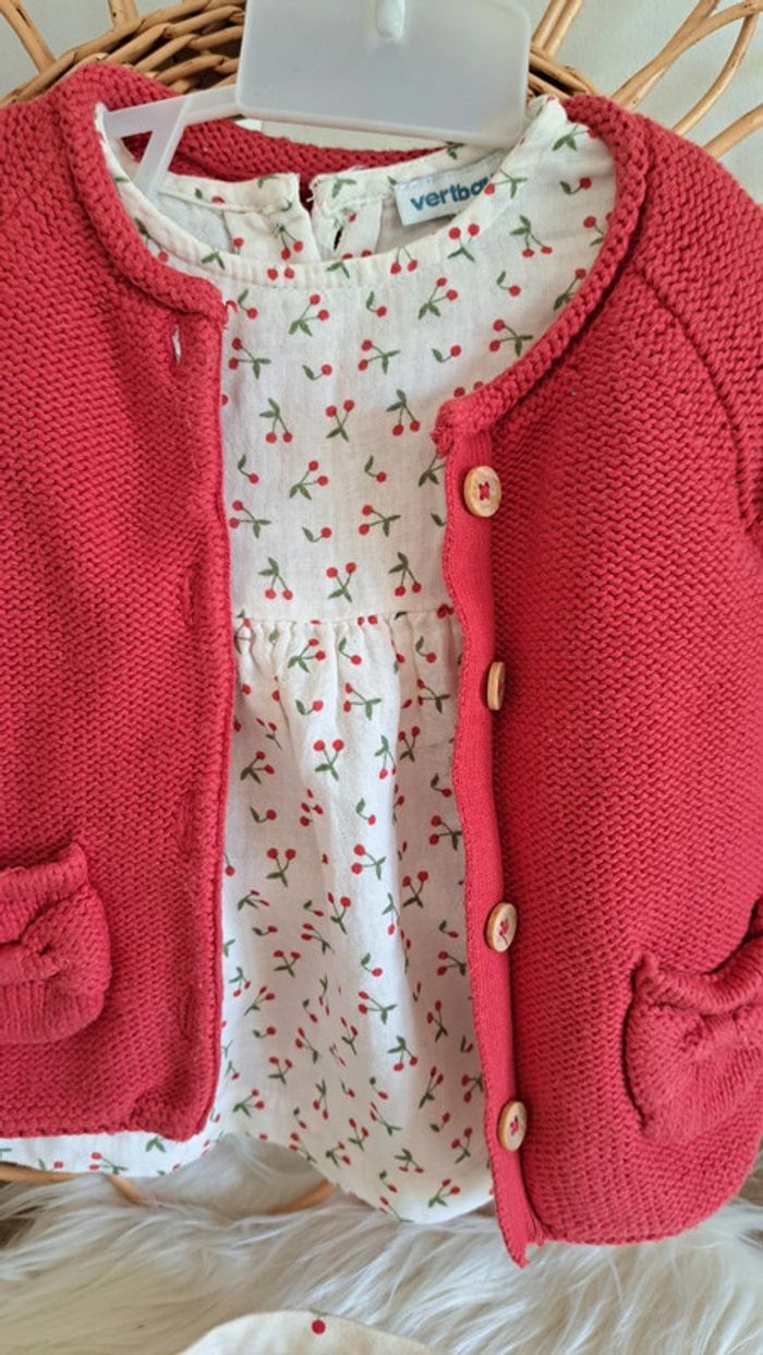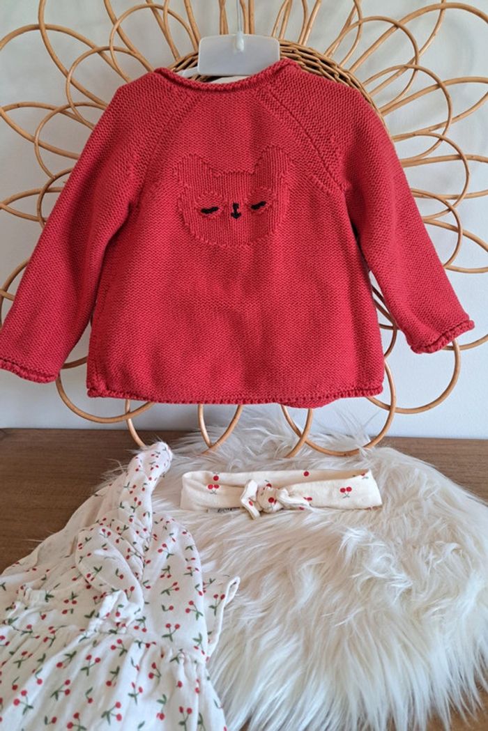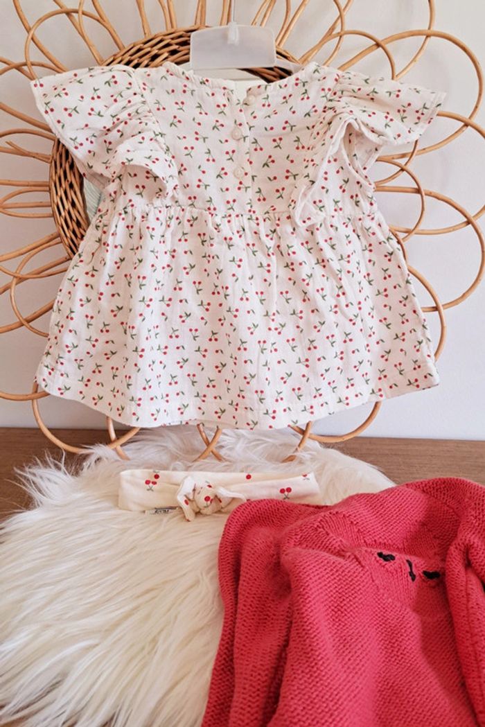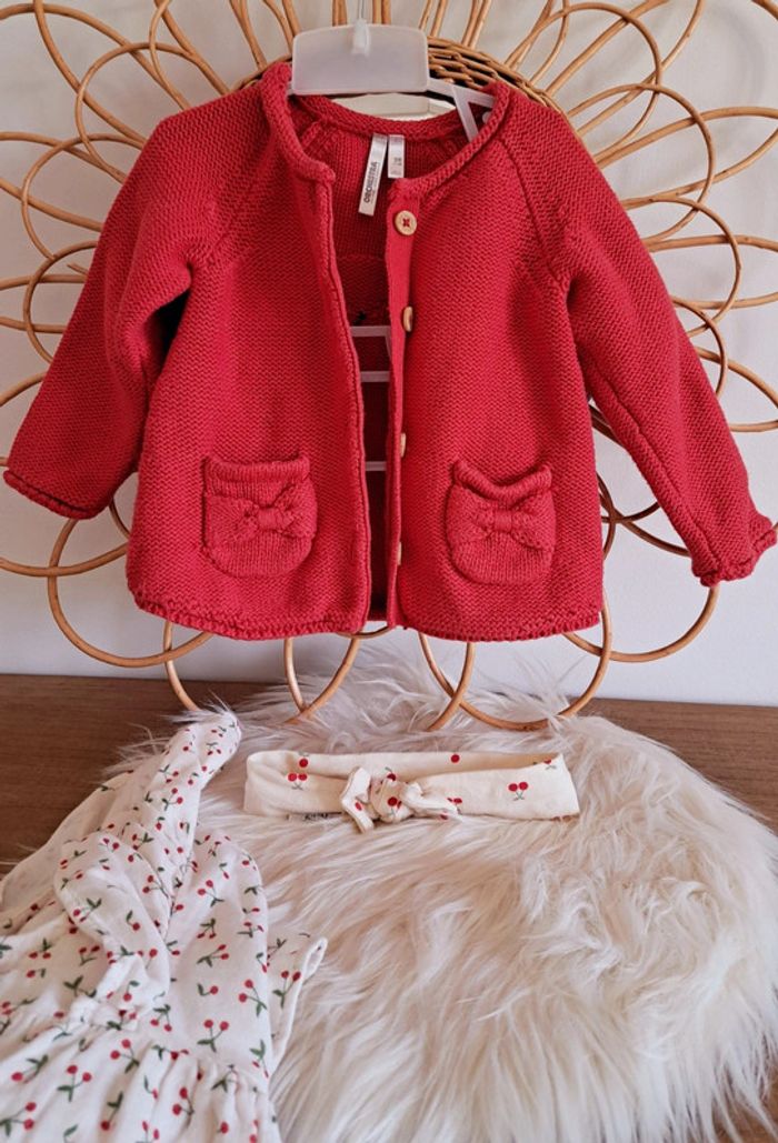 #kawin899mois ensemble 3pieces, taille 9mois 1 gilet rouge panda, orchestra 1 blouse à motif cerise, vertbaudet 1 bandeau motif cerise le tout en état impeccable voir composition photo 📷 je reste à votre disposition pour toute information complémentaire 😃