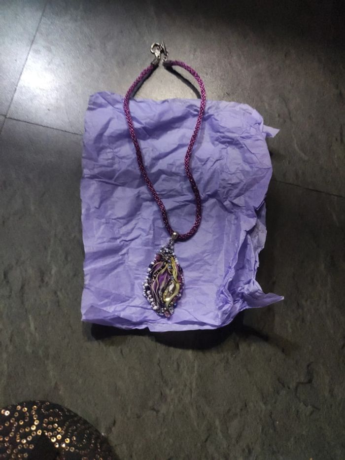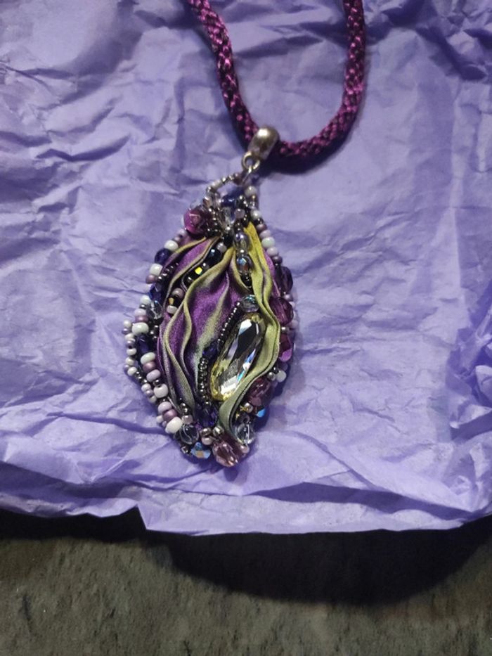 Collier artisanal acheté a une artiste fait main avec de la soie pièce unique et minutieuse