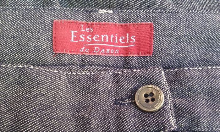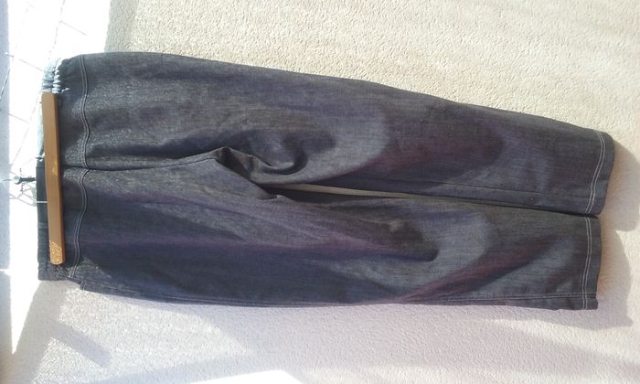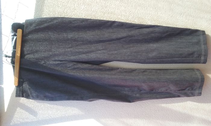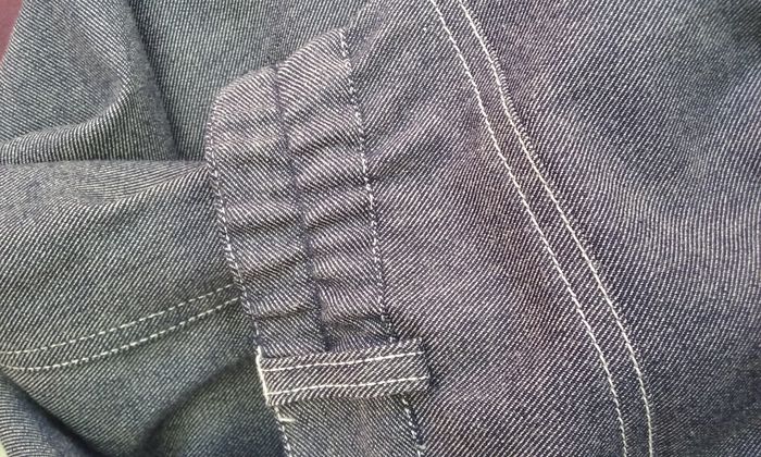 Pantalon aspect jeans, fermeture zippée et boutonnée, petits élastiques à la taille, 2 poches.