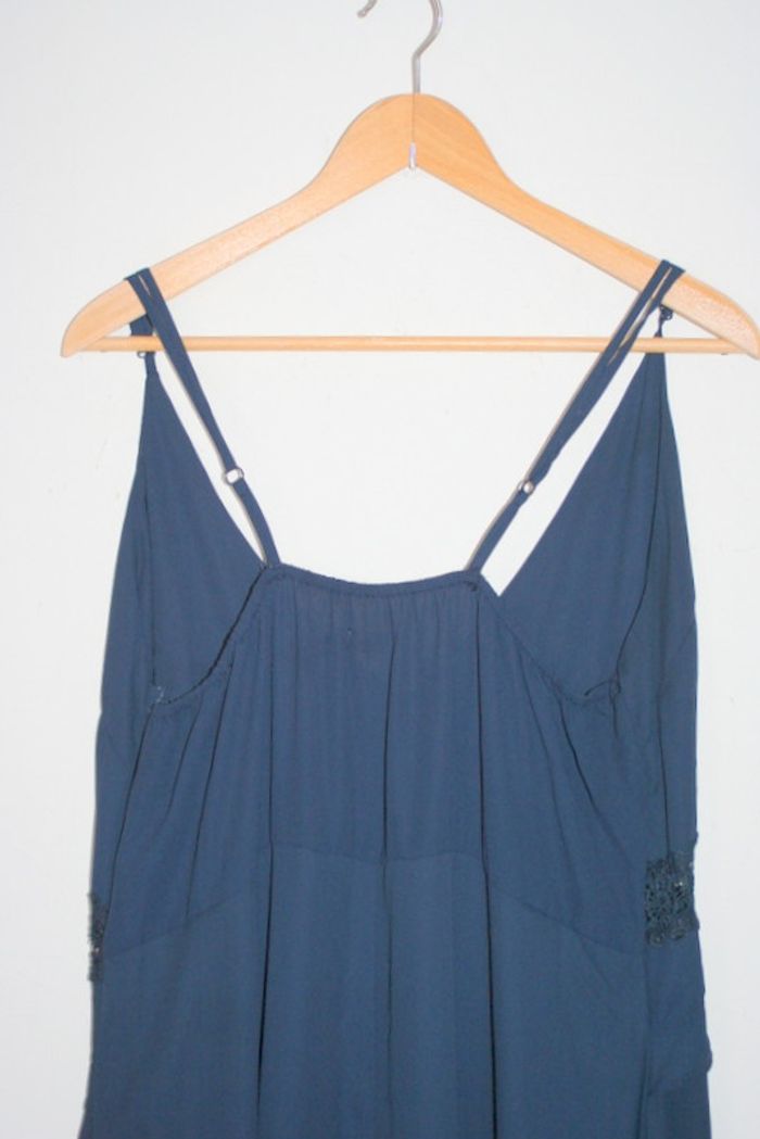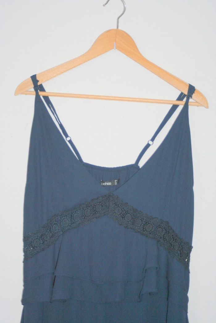 Magnifique robe longue à bretelles réglables bleu marine de chez Boohoo taille 50, 163cm de long et 50cm d'aisselle à aisselle, légères auréoles dans le voile du bas avant et arrière mais imperceptibles en photo, les parties en dentelle sont également bleu marine et non noir comme le rendu en photo, 100% polyester, 520g