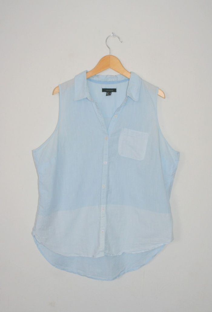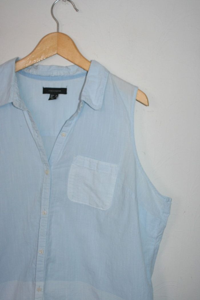 Chemise bleu ciel sans manche marque Atmosphere de chez Primark, taille 48, 100% coton, 37cm d'épaule à épaule, 60cm d'aisselle à aisselle, 66cm de long devant et 73cm de long derrière, 110g