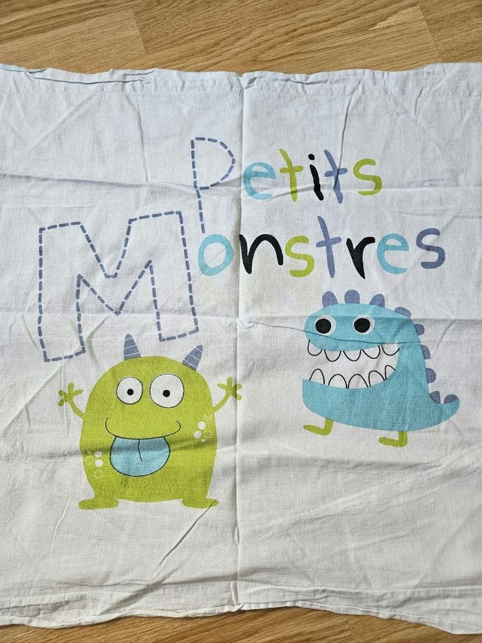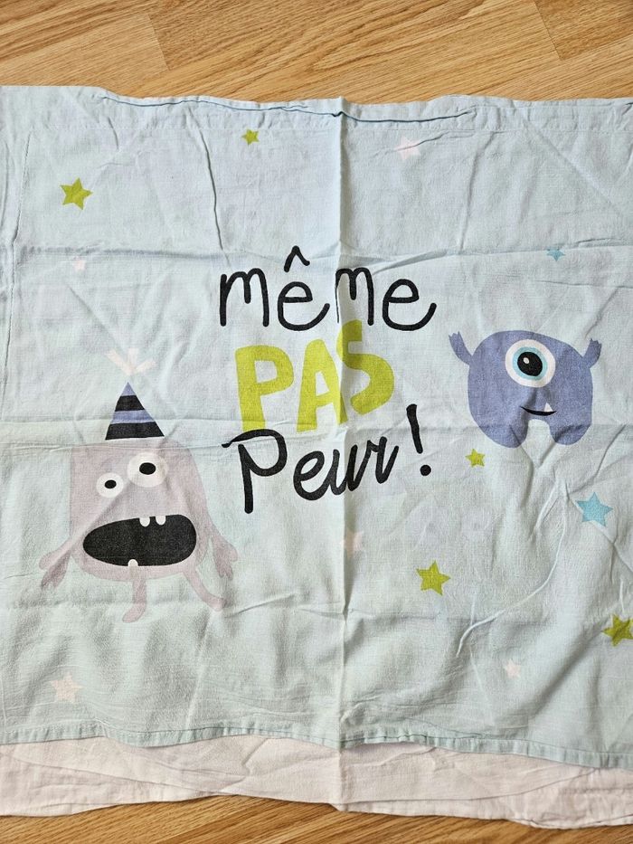 Parure de lit enfant, une housse de couette ( fermeture pression sur le bas) en 140 x 190 et une taie d'oreiller réversible ( 1 côté blanc à motifs l'autre côté bleu ciel à motifs) en 63 x63 cm