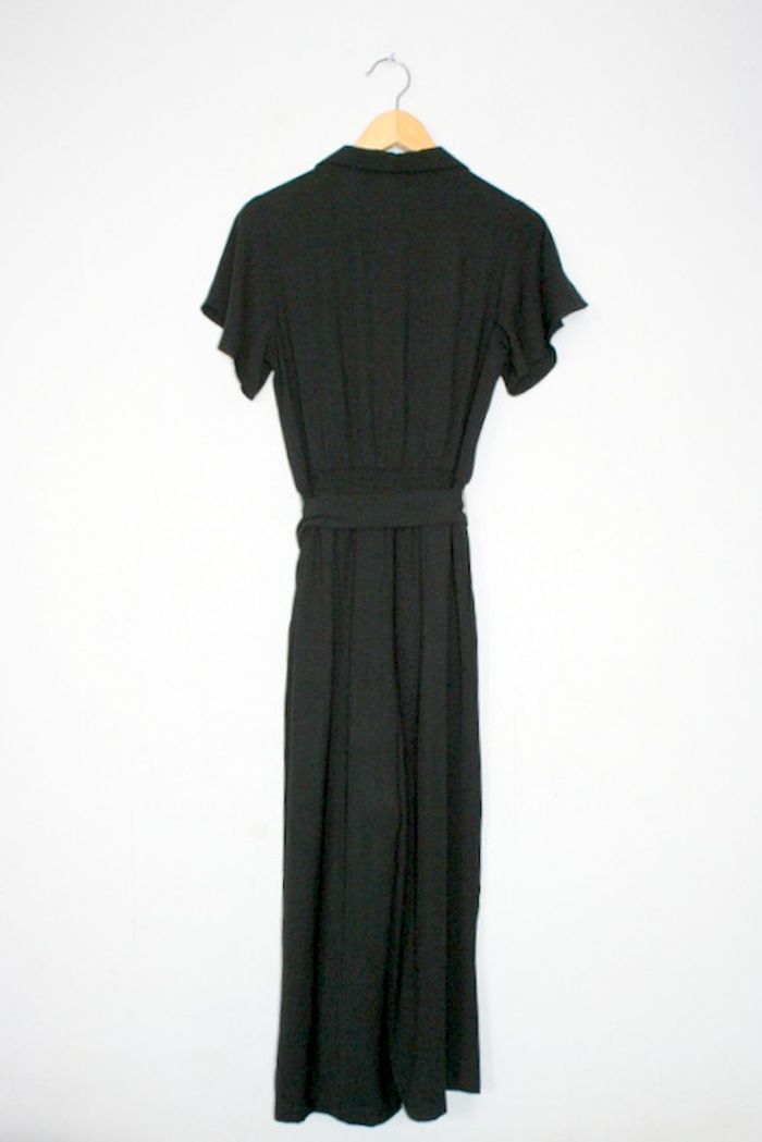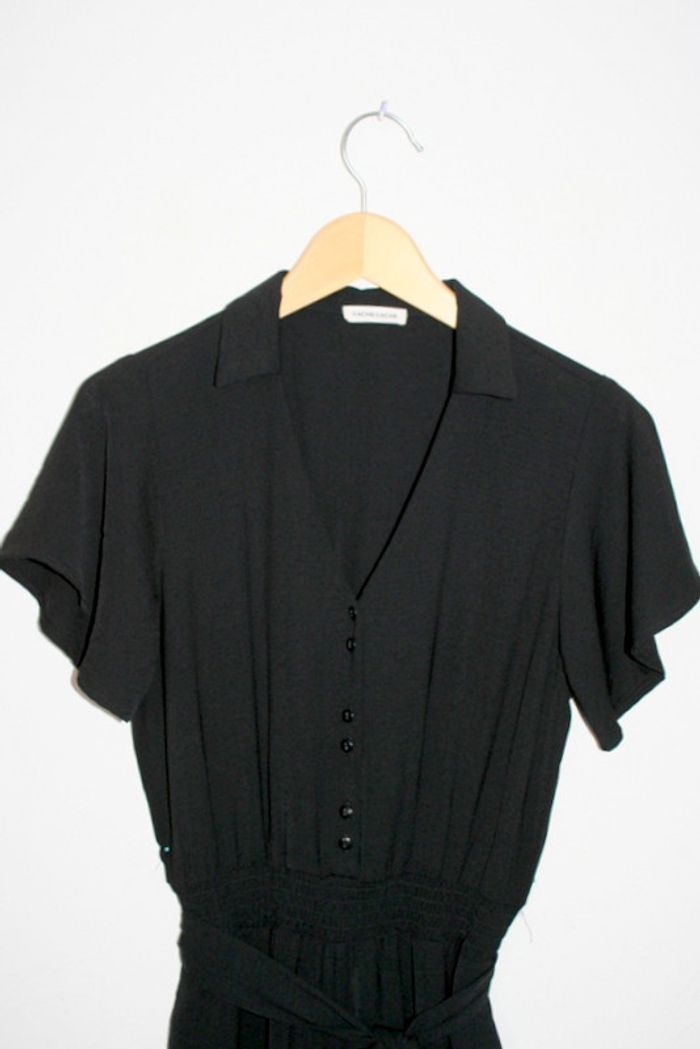 Combinaison pantalon noire de chez Cache Cache, taille 36, ceinture à la taille, 36cm d'épaule à épaule, 40cm d'aisselle à aisselle, 129cm de long, 100% polyester, 420g