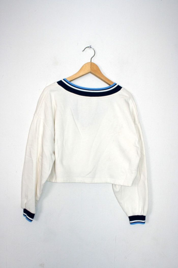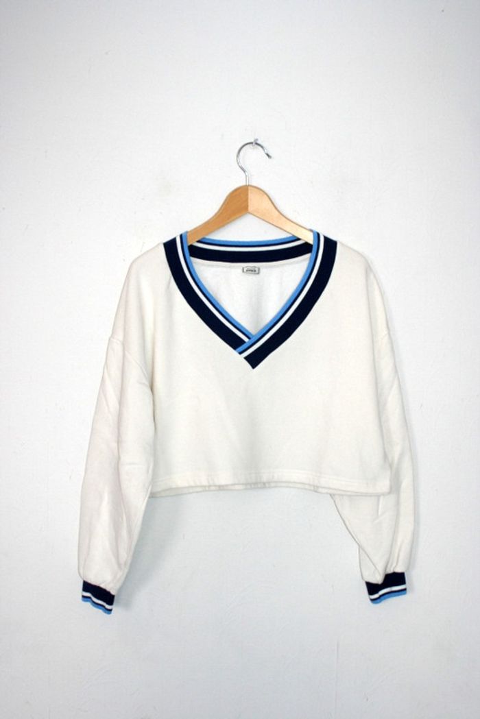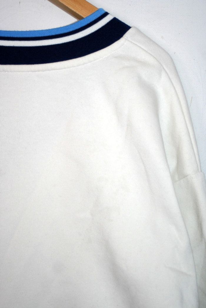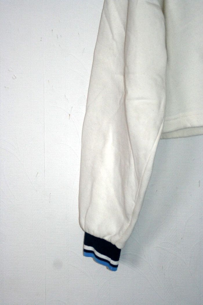Sweat court blanc cassé de chez Pimkie, taille L (sans étiquette), légères auréoles dans le dos et à l'arrière la manche droite cf photo, 46cm d'épaule à épaule, 65cm d'aisselle à aisselle, 42cm de long, 280g