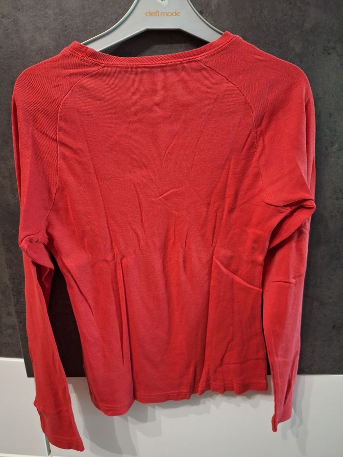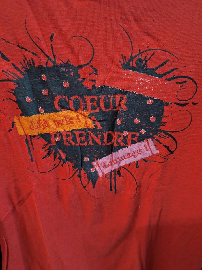 Joli t-shirt manches longues rouge, cœur noir devant avec inscriptions, taille 34, peu porté en très bon état