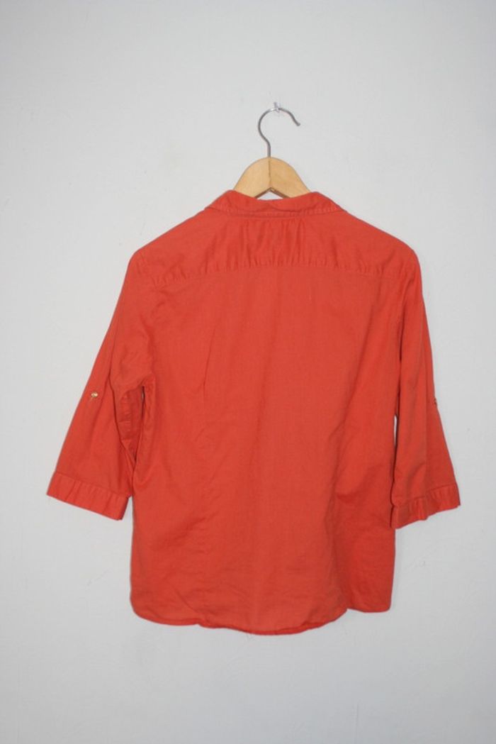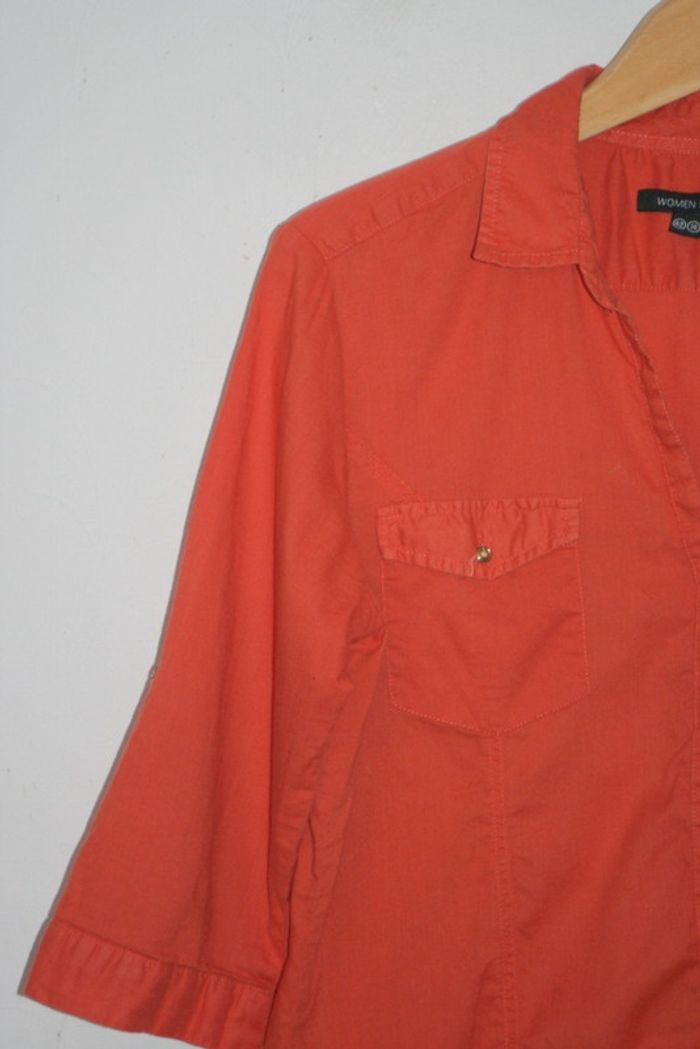Chemise orange marque Women Only taille 42, 100% coton, 50cm d'aisselle à aisselle, 56cm de long, 40cm d'épaule à épaule, manque un bouton mais bouton de rechange à l’intérieur pour le remplacer, manches retroussables, 120g