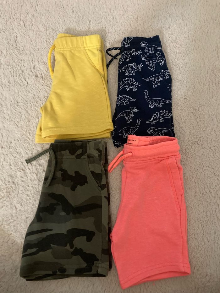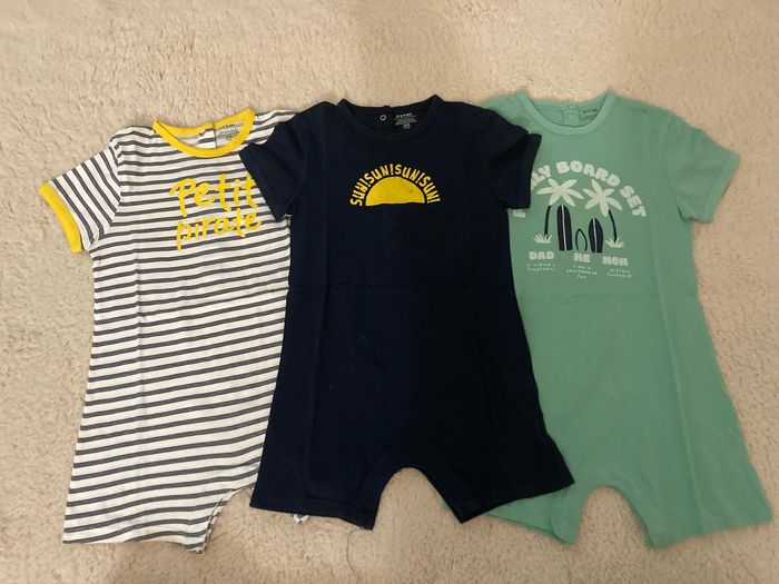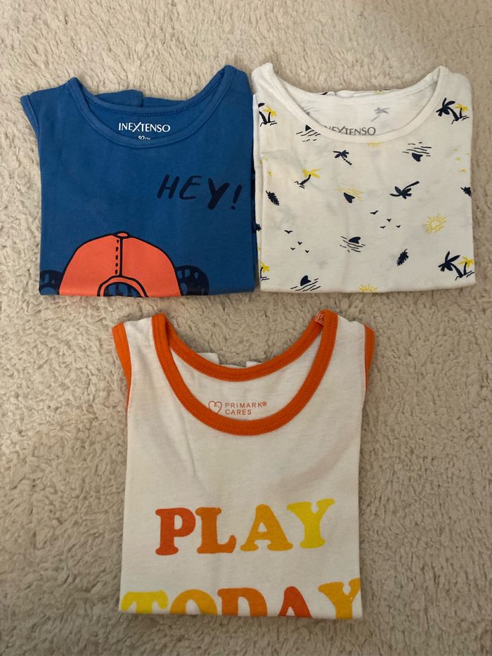 Vends ce lot en très bon état t shirt shirts combi short débardeur, short de bain avec bonnet ensemble plusiuers pieces en 18/24 moi ensemble rouge 3 ans orchestra kiabi pimark