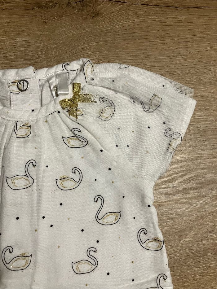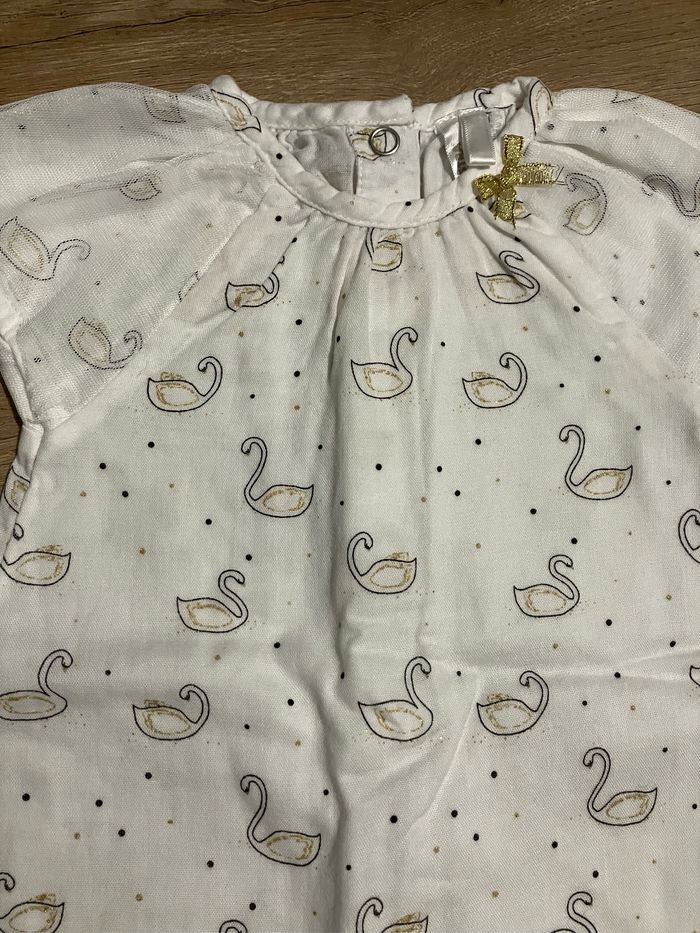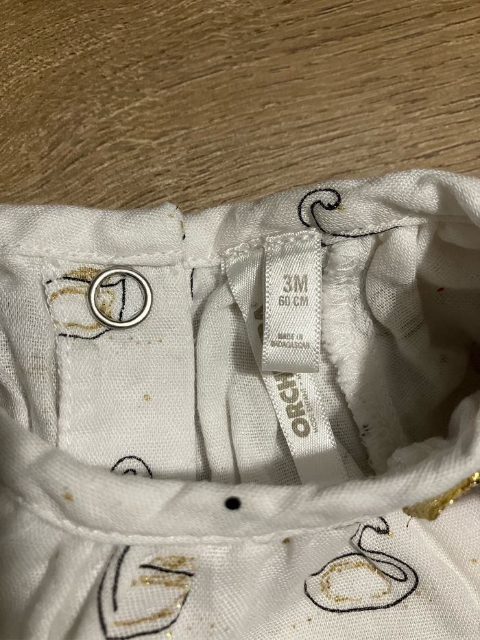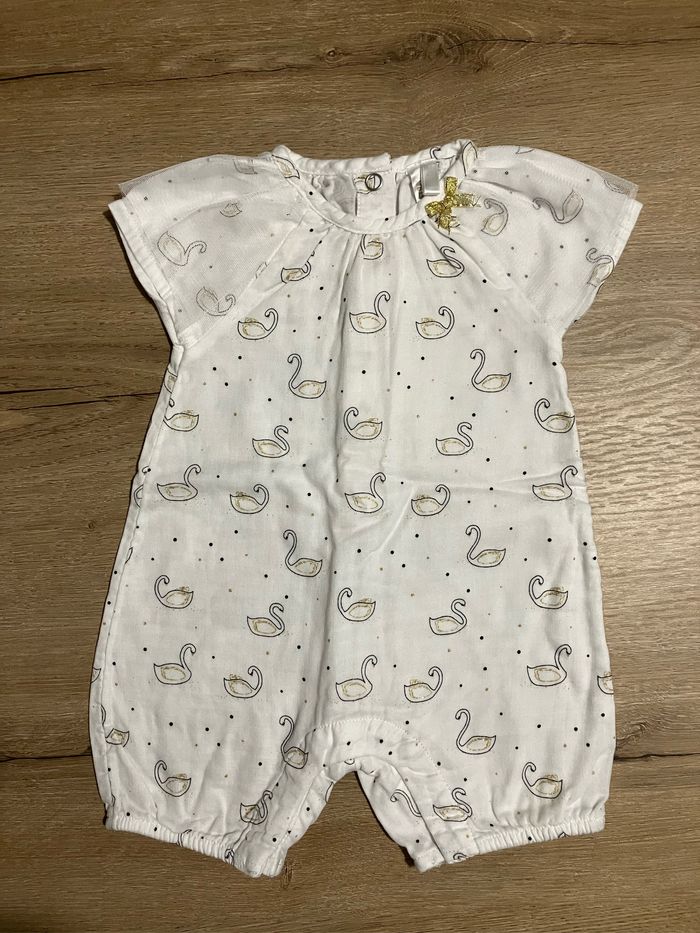 Jolie barboteuse à motifs cygnes dorés, voile au niveau des épaules Ouverture par boutons pression à l’entrejambe Orchestra taille 3 mois Parfait état