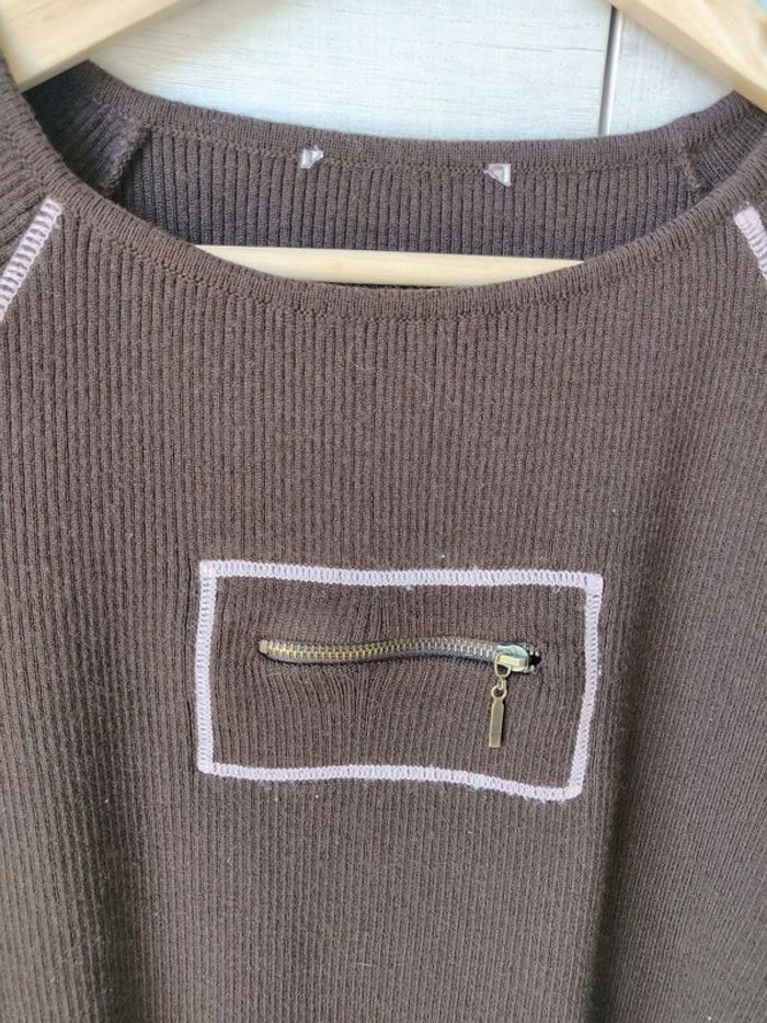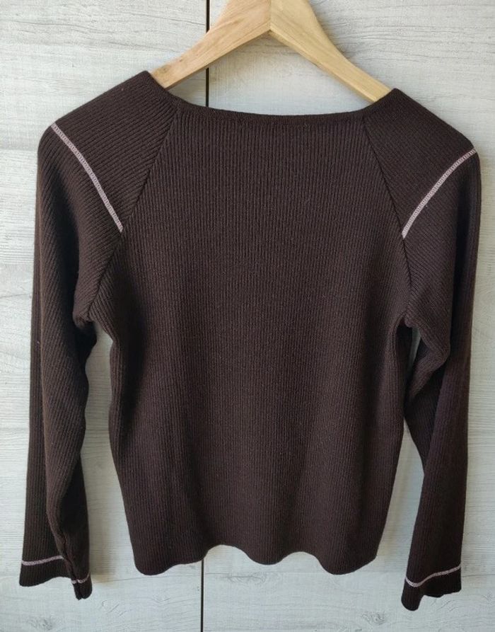 Pull marron Coutures décoratives roses. Etiquette taille coupée, correspond à un 38/40 largeur entre les aisselles : 46 cm longueur à partir de l'épaule : 55 cm longueur à partir de l'aisselle : 36 cm