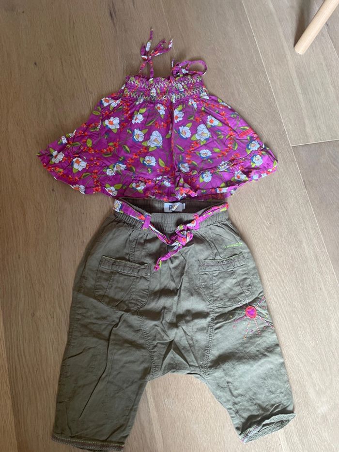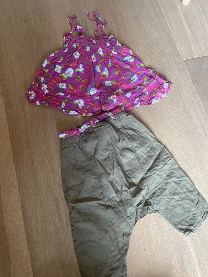 très bon état, ensemble composé d'un sarouel kaki avec ceinture rappelant le haut à bretelle fleuri, et gilet vert très joli porté #tinesha62fille24mois #tinesha62fille2ans