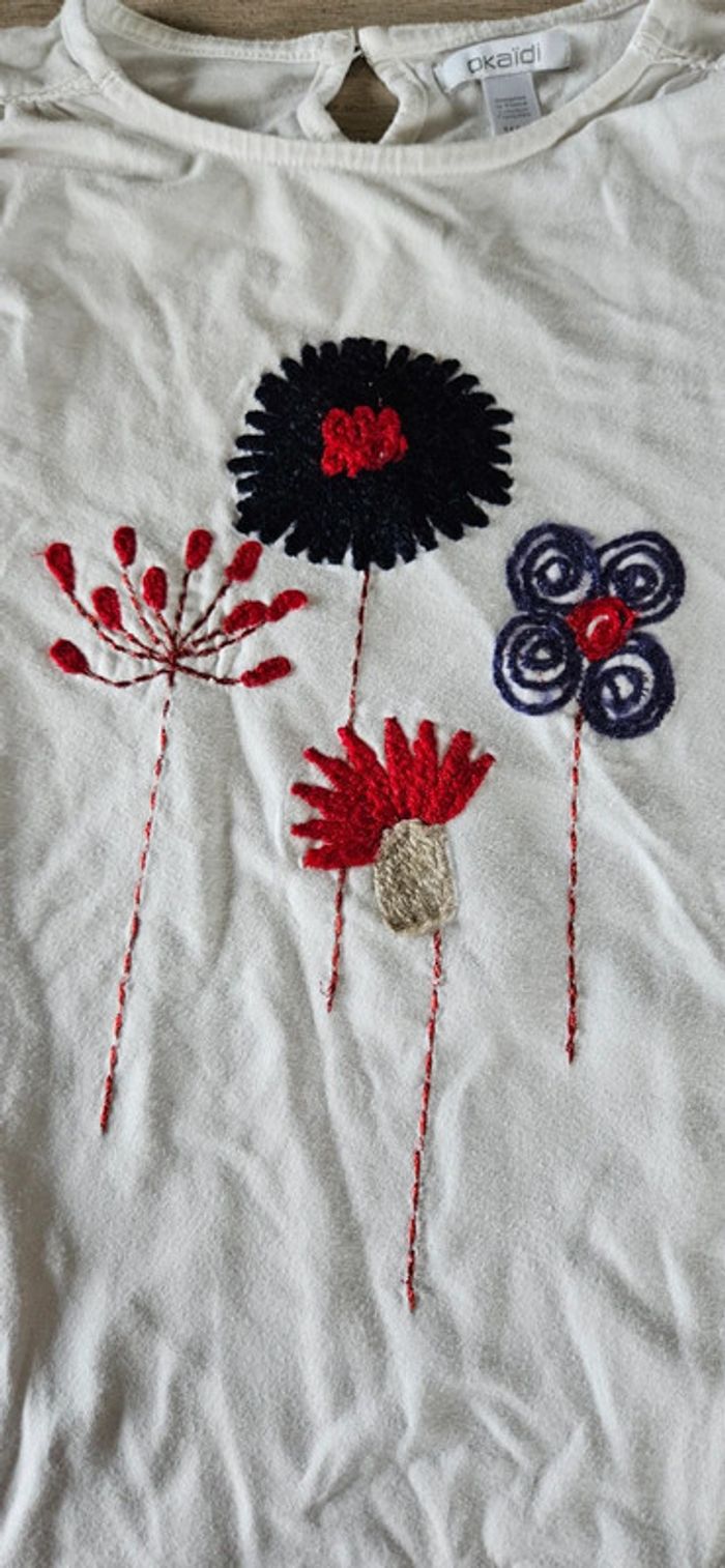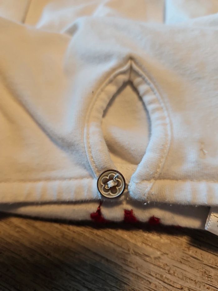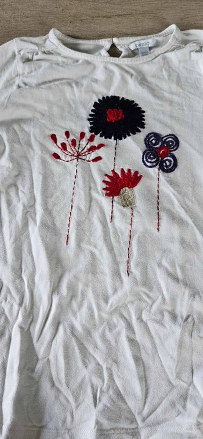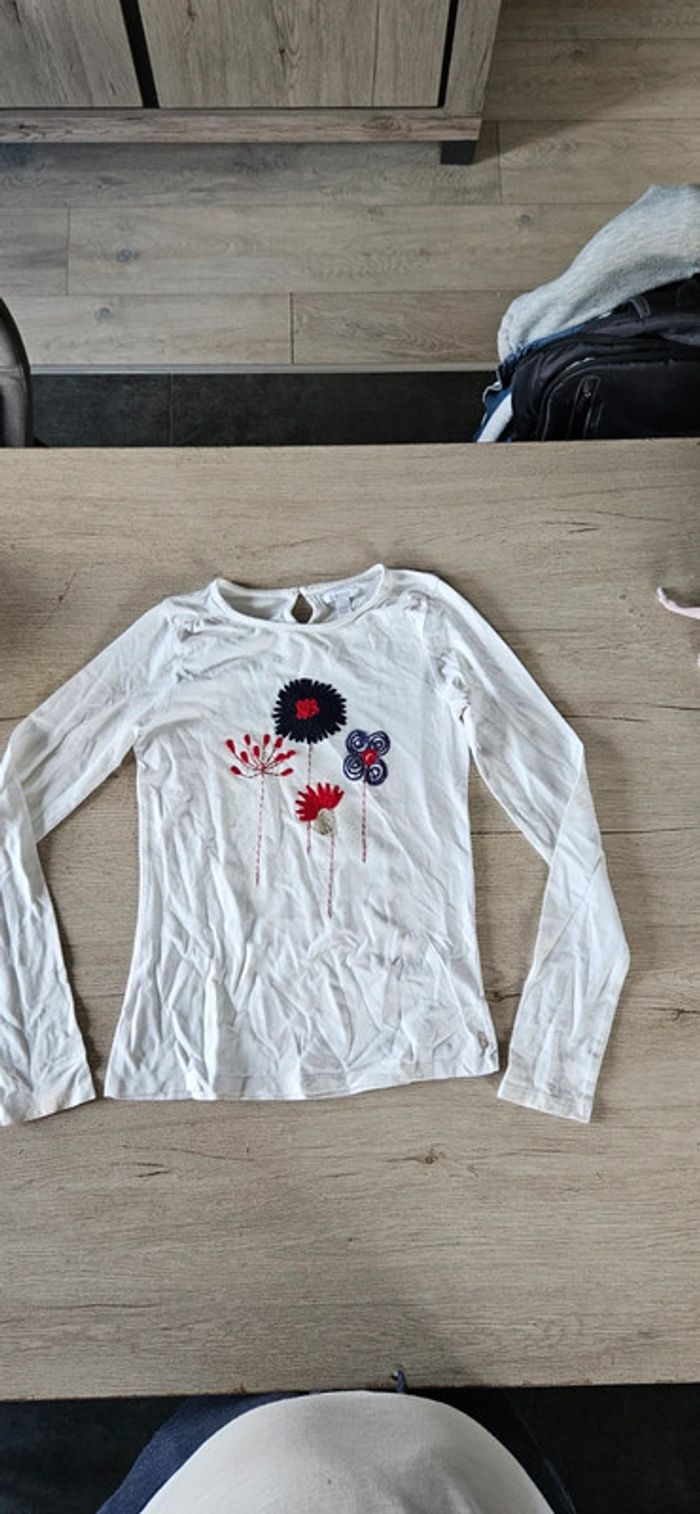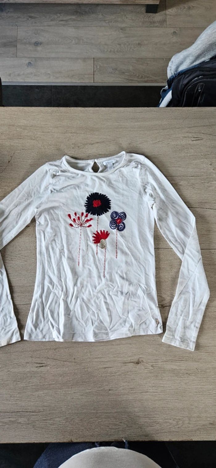 T shirt blanc à manches longues pour fille. Convient pour du 12 à 14 ans, peu mis. Col rond. Peut se fermer à l arrière avec un petit bouton. Dessin en espèce de laine. Élastique #deborahtock_14 ans