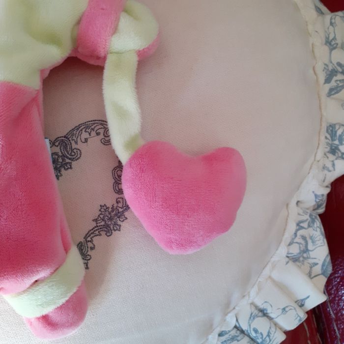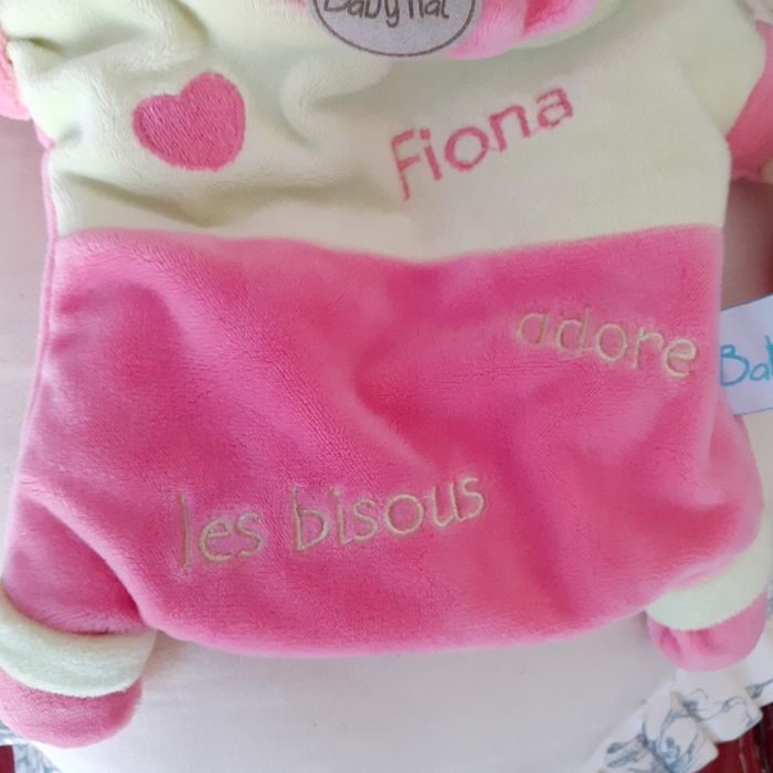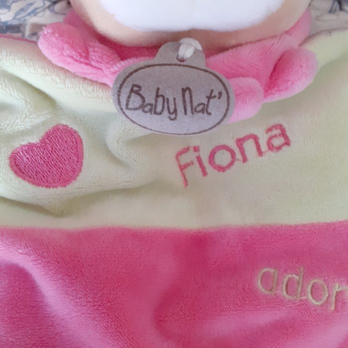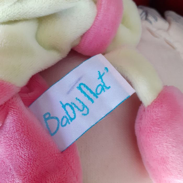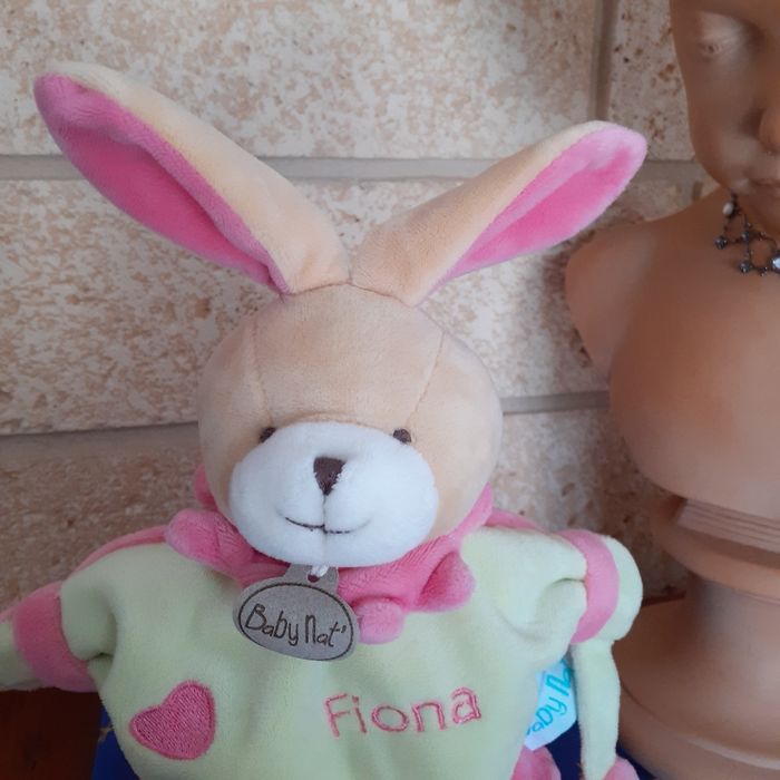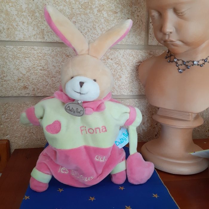 Doudou-Marionnette marque Baby Nat; modèle Fiona. Lapinou avec tête rembourrée ;yeux-nez-bouche brodés; inscriptions devant; petit 🤍 attaché ( non amovible ) avec bruit de papier froissé. Bouts des 4 pattes rembourrés ( idéal pour être mâchouillés) Hauteur totale ( sans les oreilles) de 23 cm. Lavable à30° // voir photos pour détails. À Noter : une petite marque sur l'étiquette ( dernière photo)