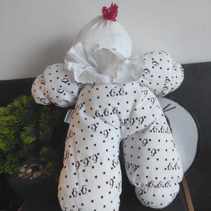 Ancien Vintage doudou Lutin blanc petit bateau Collerette tissu pingouin Peluche