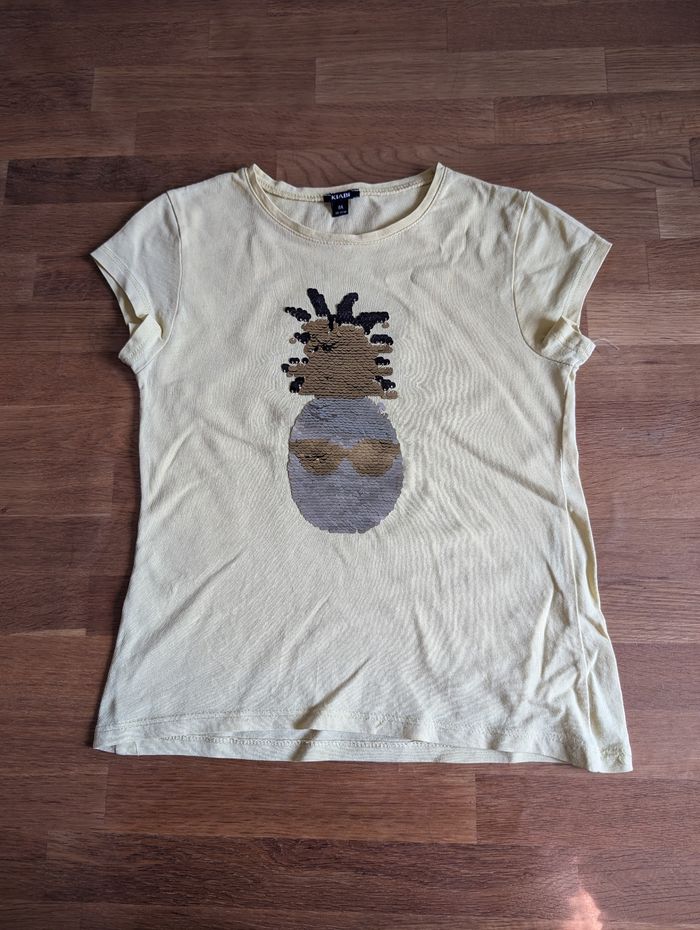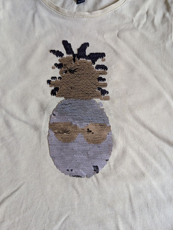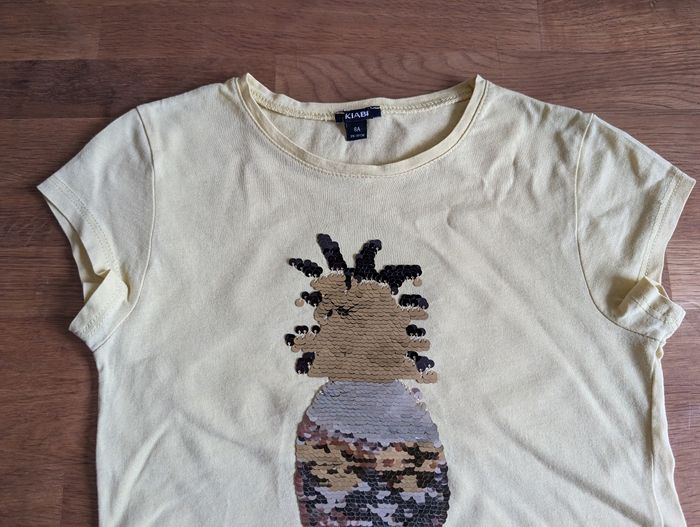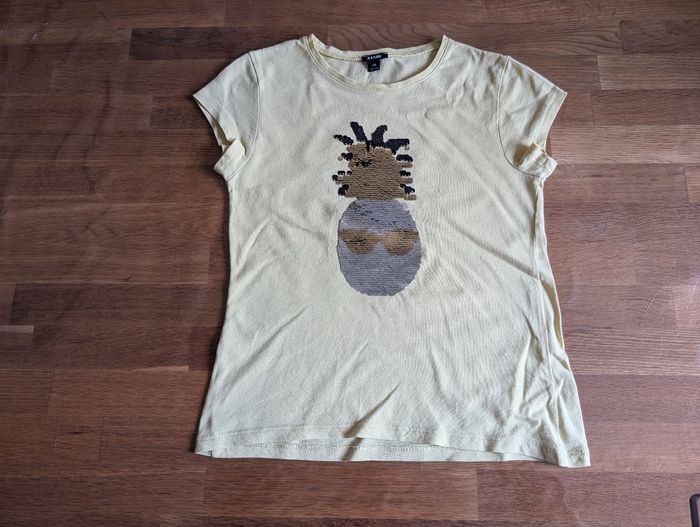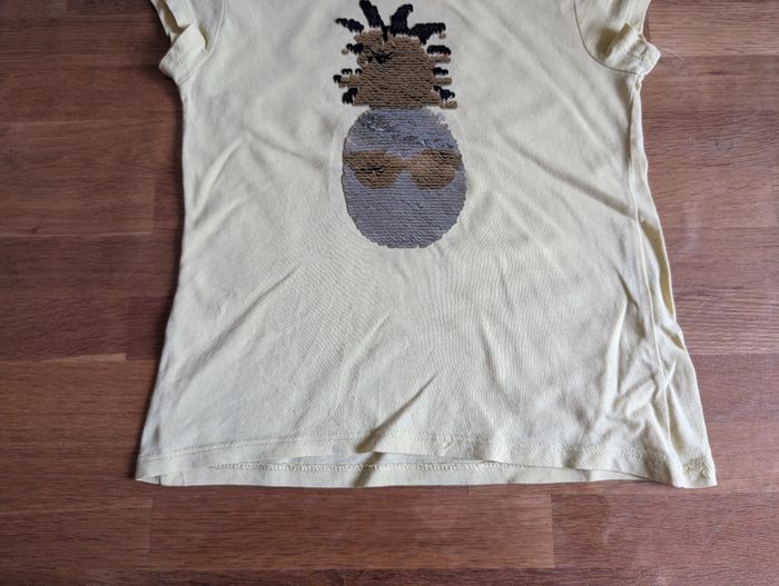 T-shirt Ananas fille 8 ans Kiabi Très bon état, jaune, motifs ananas avec des sequins, l'ananas porte des lunettes, étiquette intérieure coupée.