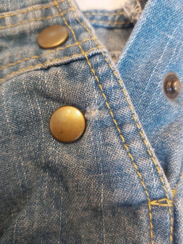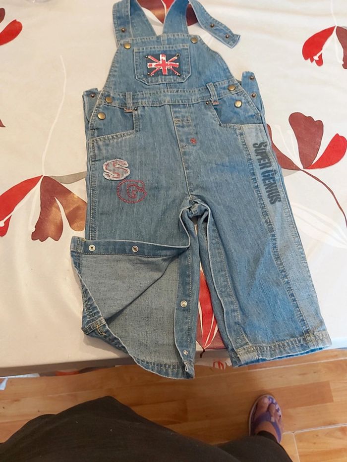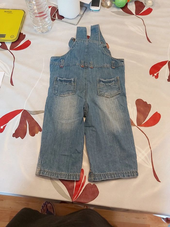 Salopette en 18 mois Fermeture des bretelles avec des pressions réglable sur 2 hauteurs Ouverture en pressions entre les jambes Petit accroc à côté d'un pression (voir dernière photo) Sinon bon état