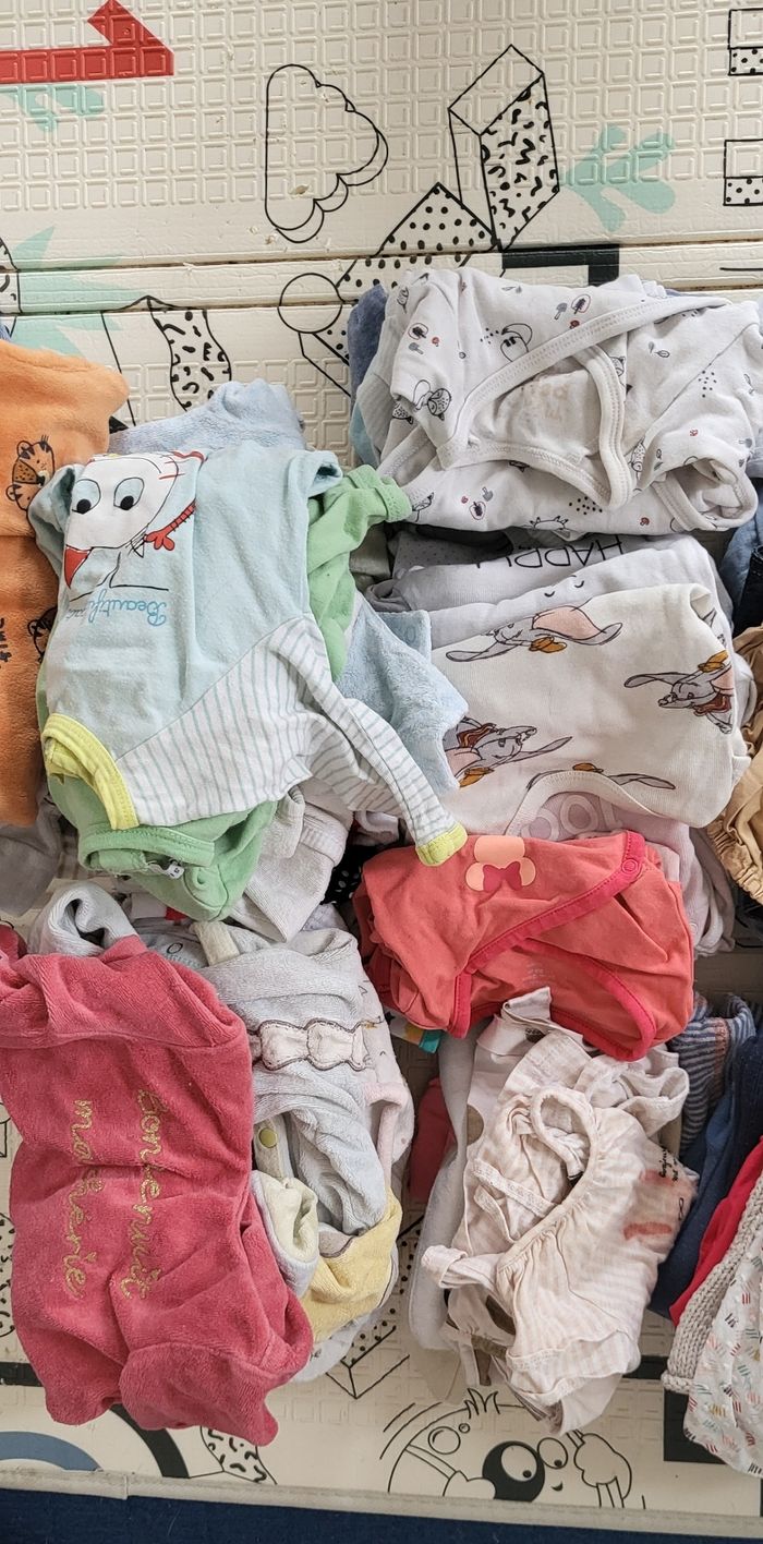 Lot de vêtements taille 3 mois en très bon état, certaines pièces sont mêmes neuves. Comprends : - 7 pantalons - 4 salopettes - 3 gilets - 5 robes - 4 hauts - 6 body manches courtes - 12 body manches longues - 16 pyjamas - 3 pantalons de pyjama Diverses marques.