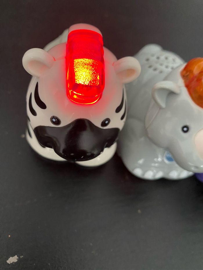 Lot animaux go go smart vtech Aldo Le rhinocéros super costaud Réglisse le zèbre à malice Lilo l’hippopotame rigolo Tut Tut Animo Des animaux lumineux qui roulent, parlent et chantent ! Déclenchement de phrases, chansons, mélodies et sons amusants quand : - On appuie sur le bouton lumineux de la tête articulée - L'animal roule - L'animal passe sur une zone magique (pistes Tut Tut Bolides et Tut Tut Animo) De 12 mois à 5 ans Vtech 2 piles LR03 non fournies pour chaque animal ou voiture