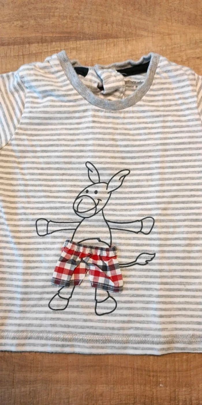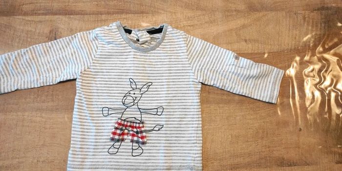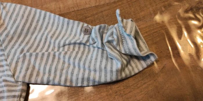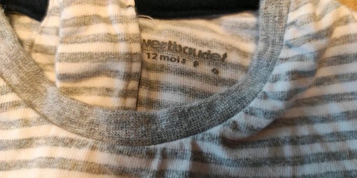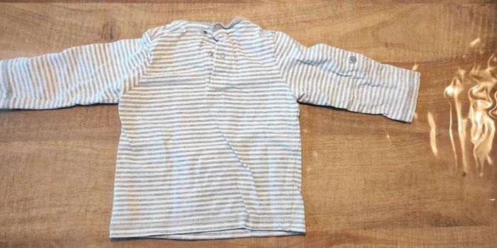 Tee shirt blanc rayé gris. Les manches peuvent se retourner et s'attacher avec un petit bouton (voir photo). Très bon état. Taille 12 mois.