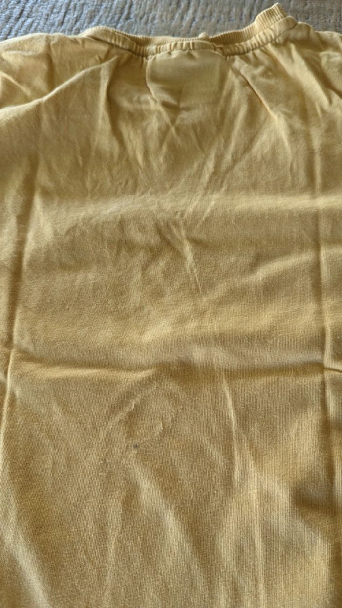 Tee shirt jaune moutarde clair. A signaler : une petite tâche dans le dos (voir photo) elle ne se voit pas beaucoup mais je préfère le signaler.