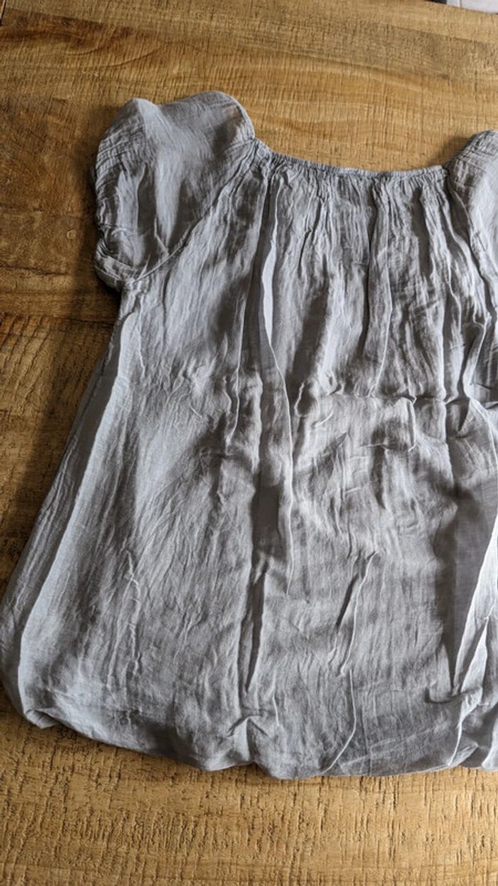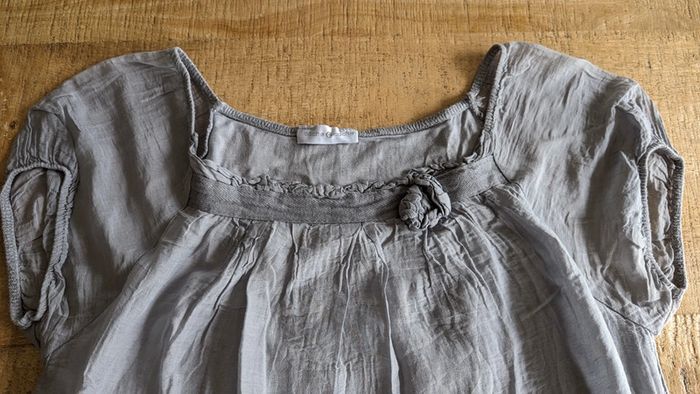 Tee shirt, partie extérieure fluide en coton et soie. Partie intérieure en viscose et elasthanne.