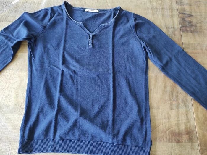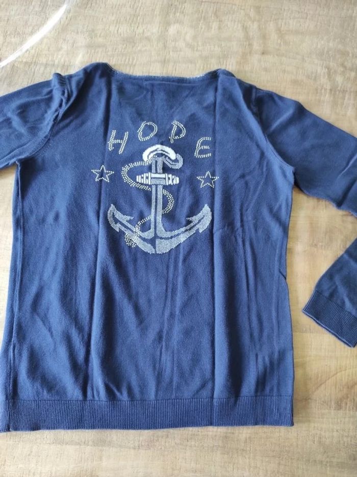 Pull marine manches longues. Col V et dessins d'encre dans le dos avec petites perles argentées. Taille 2 qui correspond à du M/38-40.