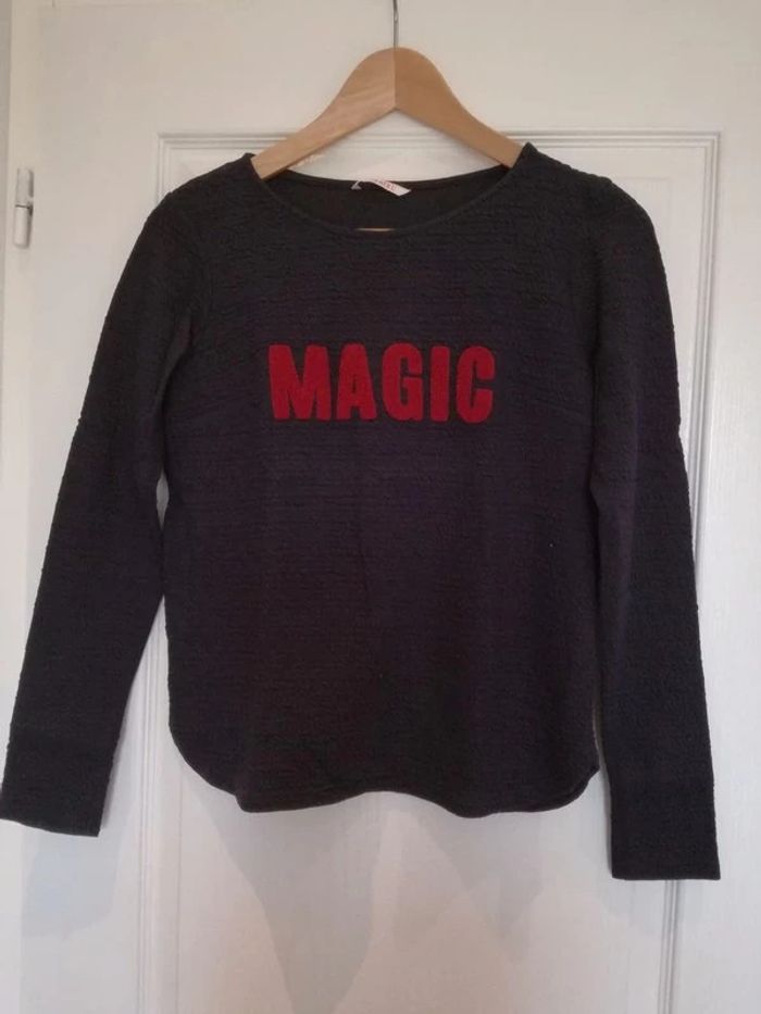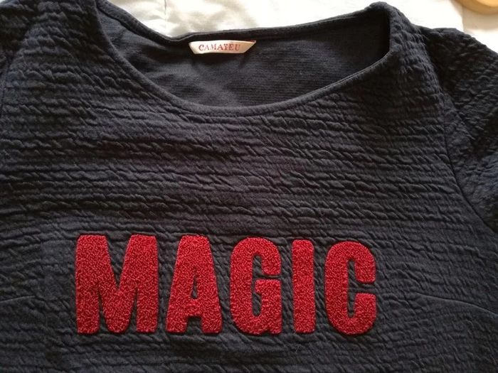 Pull molletonné bleu marine avec inscription "Magic" en relief et en rouge. 77% coton, 22% polyester, 1%élasthanne.