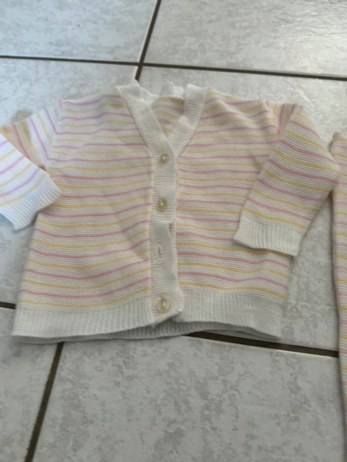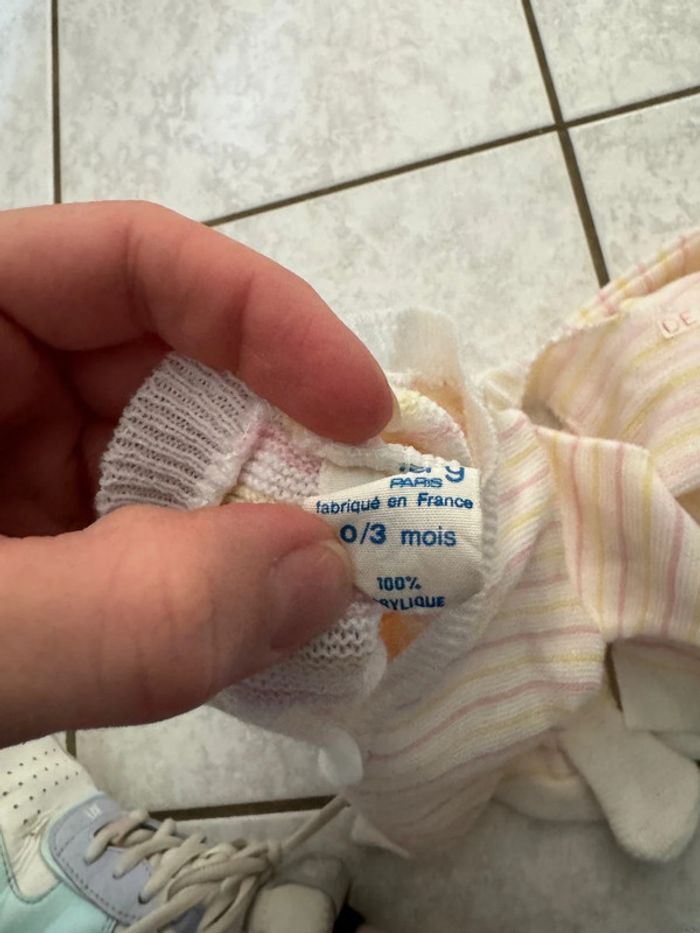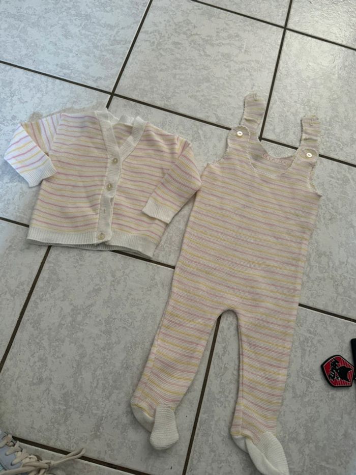 Ensemble bébé fille blanc a rayures jaune et rose, la combinaison fait du 3/6 mois et le gilet du 0/3 mois . Très bon état #floreteddy_taille3mois #floreteddy_taille6mois #floreteddy_bebe
