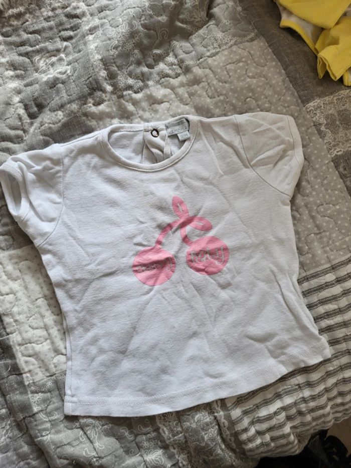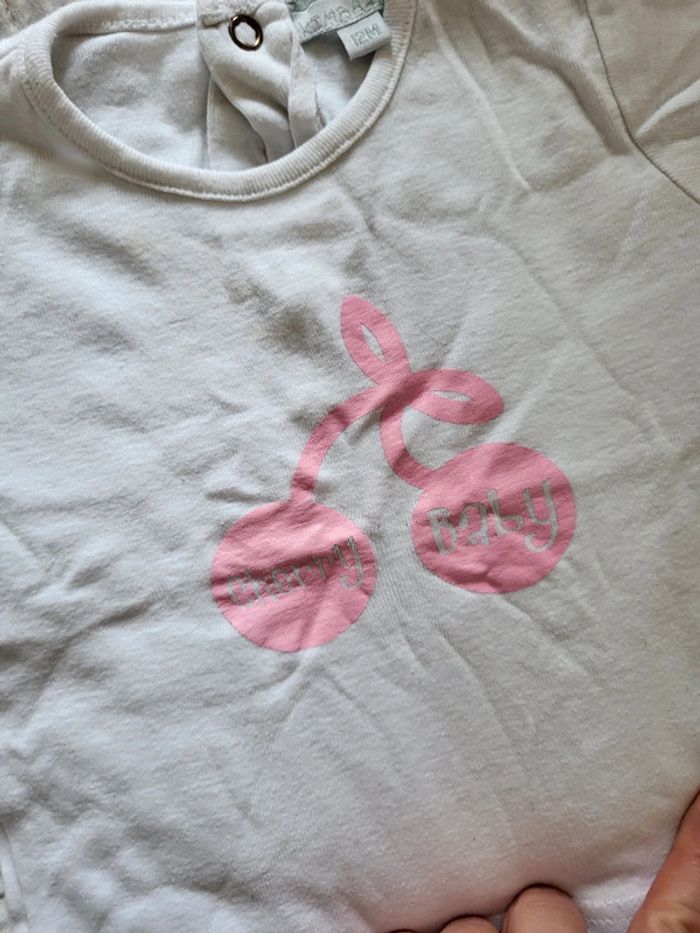 Tee shirt blanc cerise rose en taille 12 mois de Kimbaloo, juste une tâche près du col voir la 2eme photo. Bon état. #floreteddy_taille12mois