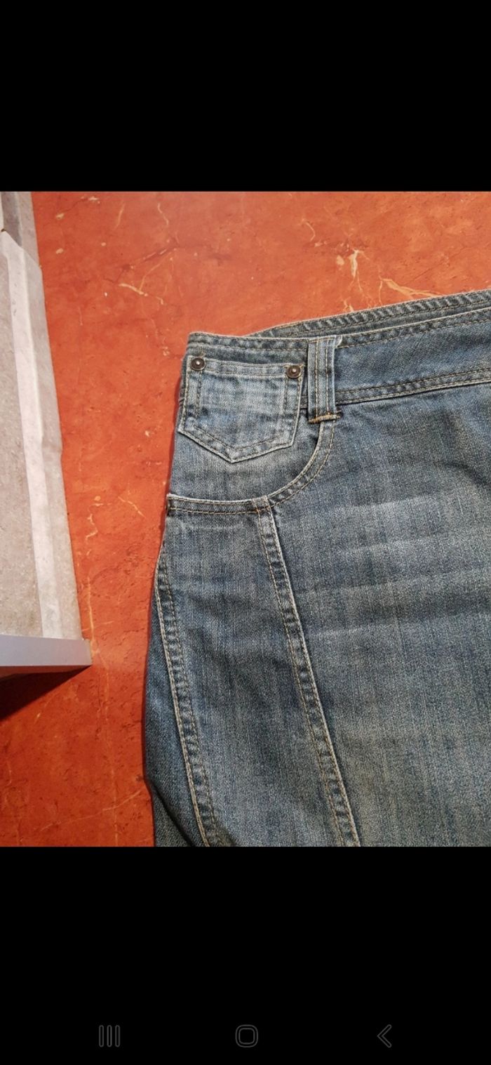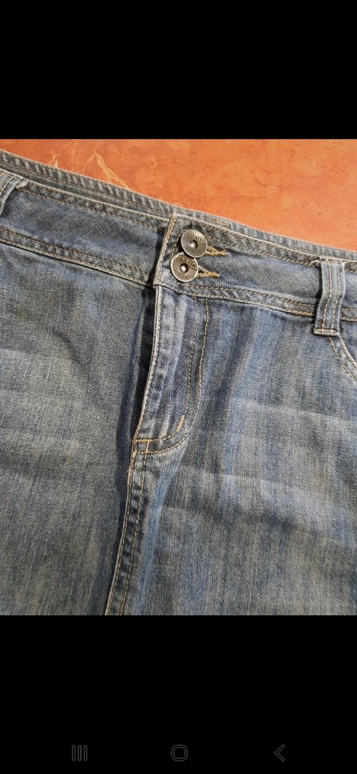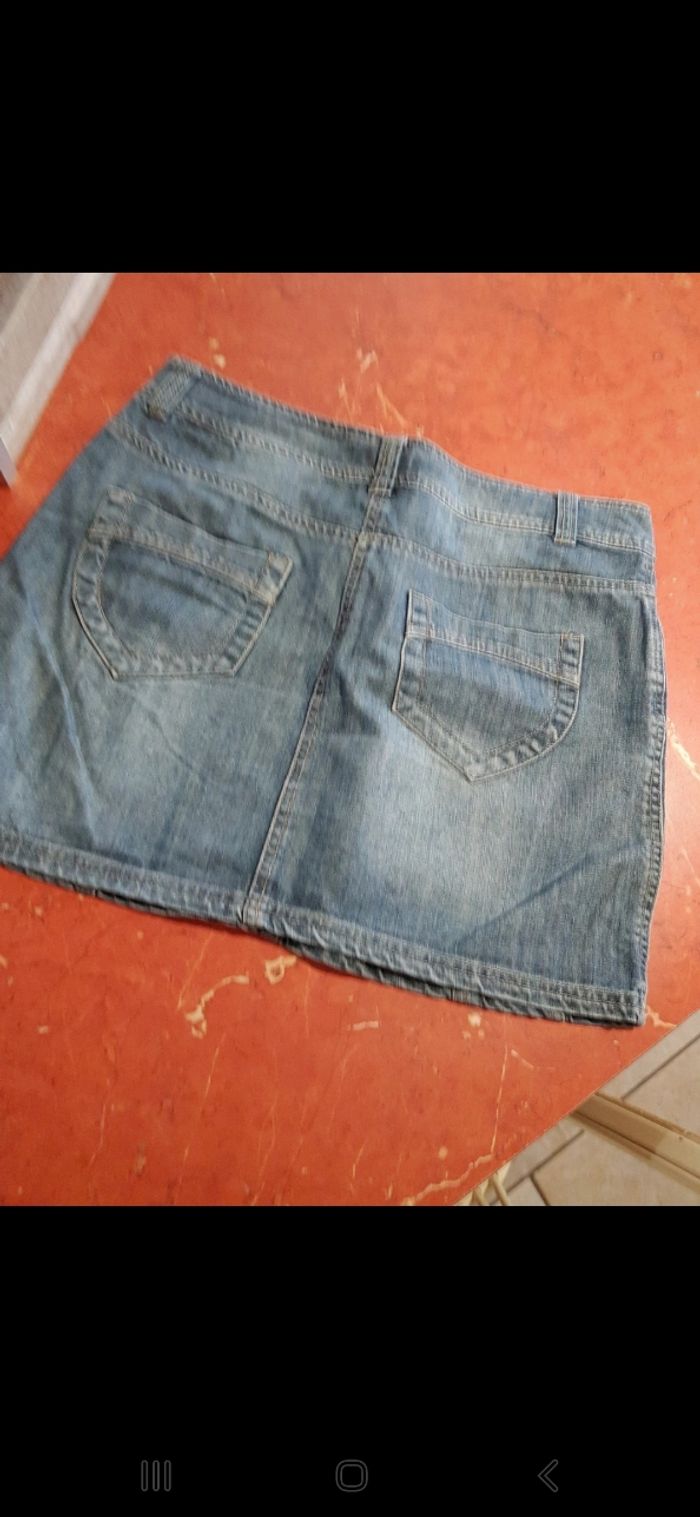 Jupe en jean avec 2 poches à l avant et à l arrière. Fermeture par zip et 2 boutons. En parfait état