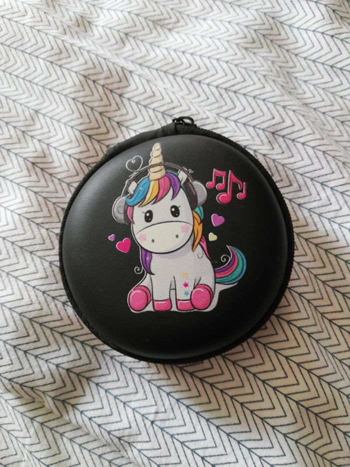 Petite boîte ronde dessin licorne pour ranger les écouteurs ou de la monnaie. Neuf jamais servi