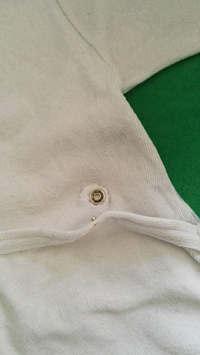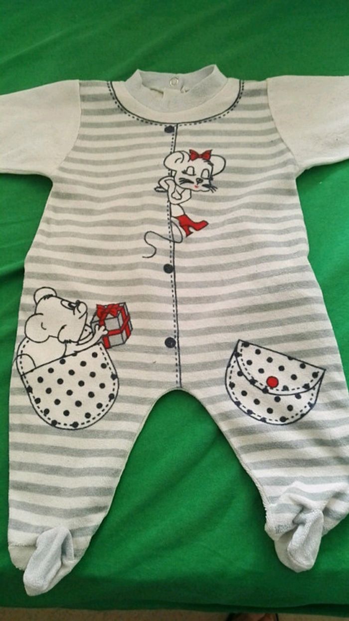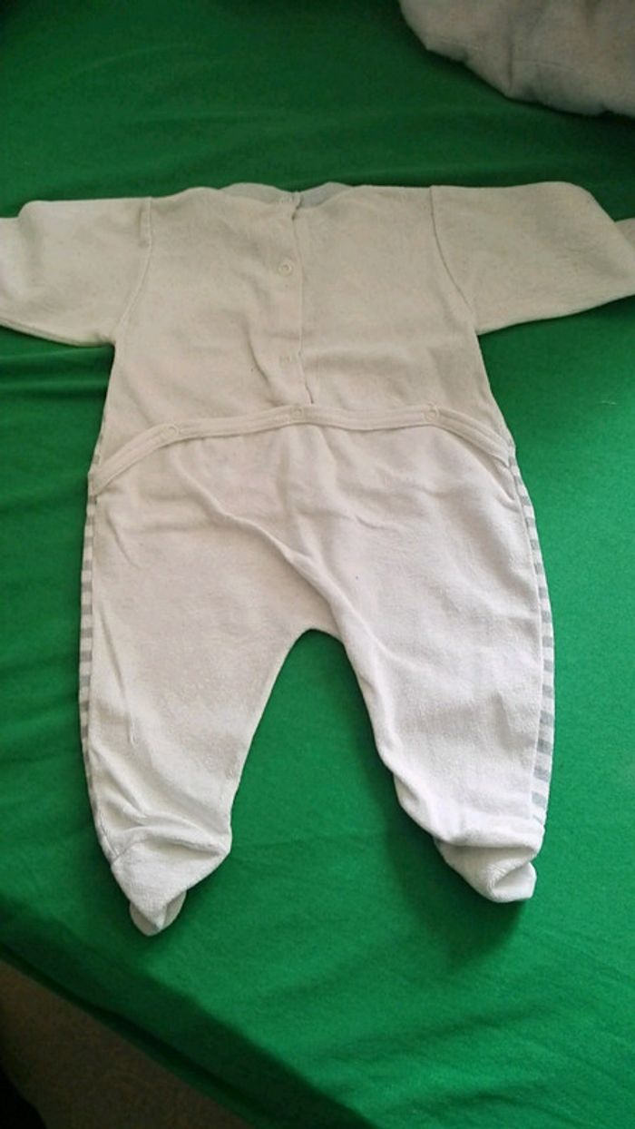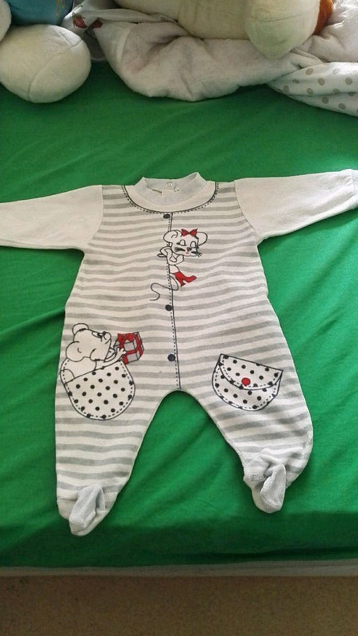Pyjama blanc et gris avec dessin de souris. Taille 3 mois, juste un petit problème avec une pression mais rien de grave je ferais le petit point de couture.